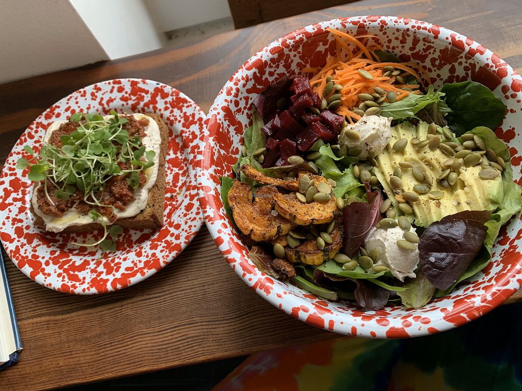 don’t know why i’d never heard of this all vegan gf bakery but had to go and try everything of course..think we ended up trying a maple bun, cinnamon roll, pesto roll, gallette, bagel, and burrito. everything was yum but like can def tell it’s vegan and gf. the baked goods were pretty crumbly and grainy but still tasted good..service fine but not amazing and also pricey🙃but still like..it’s all vegan and gf so⭐️ xx