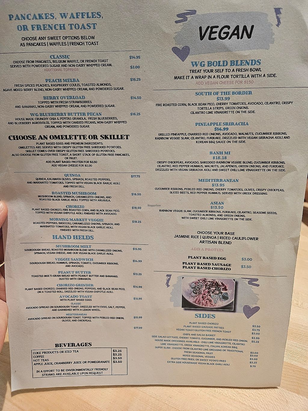 Hello! Thank you for the feedback. To address some of your concerns… if you order our gluten free pancakes or waffles they are vegan. You can also let your server know you want to order vegan and we can help drive what we can or can not place in your breakfast.