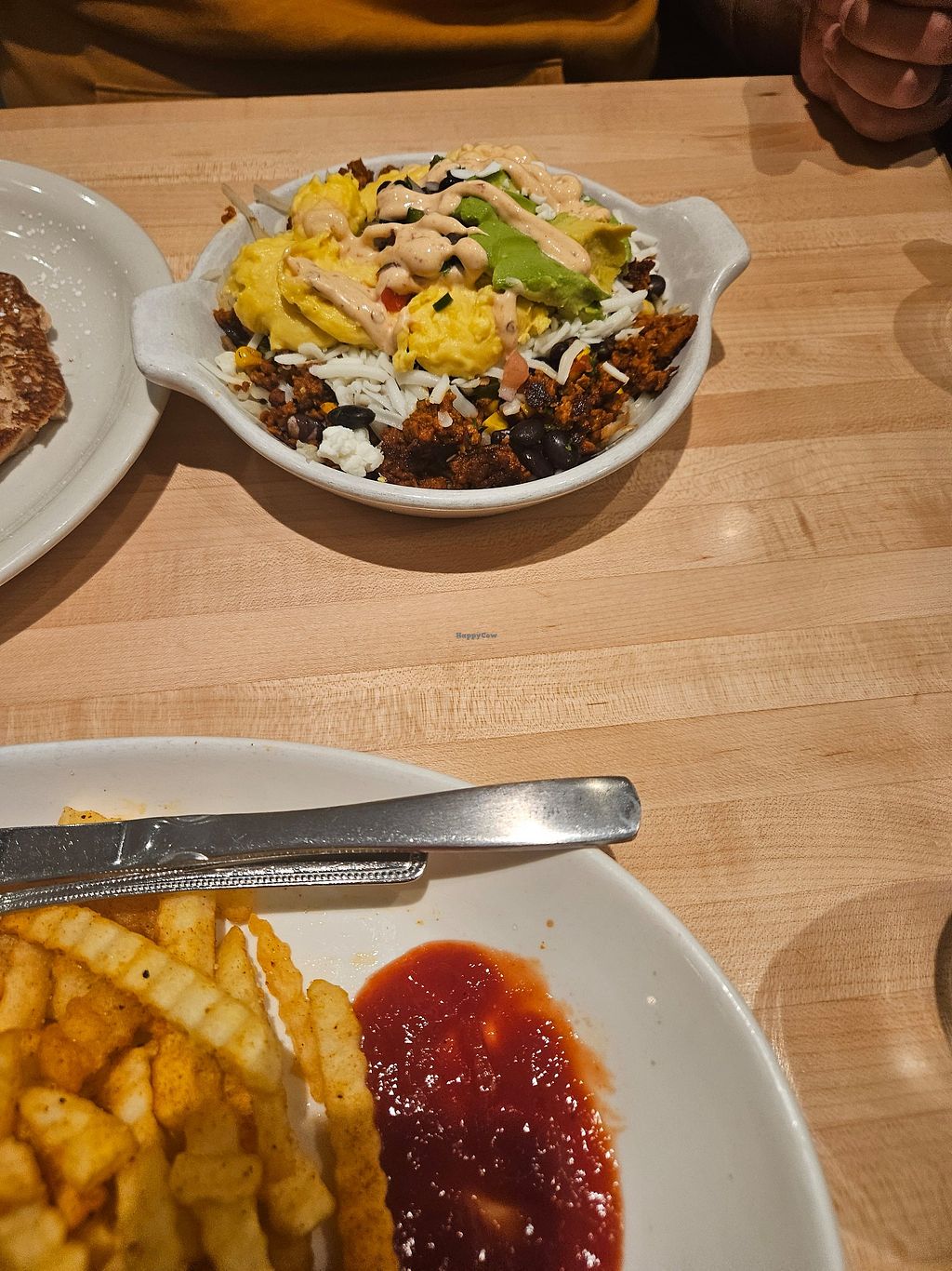Flavors are on point and there’s a lot of vegan options. Lots of ways to modify dishes. Offers vegan eggs, plant based chorizo and plant based sausage patty. The chorizo omelette rocks. Sriracha pineapple bowl is also very good. The menu shows you what to take off or add to make it vegan.