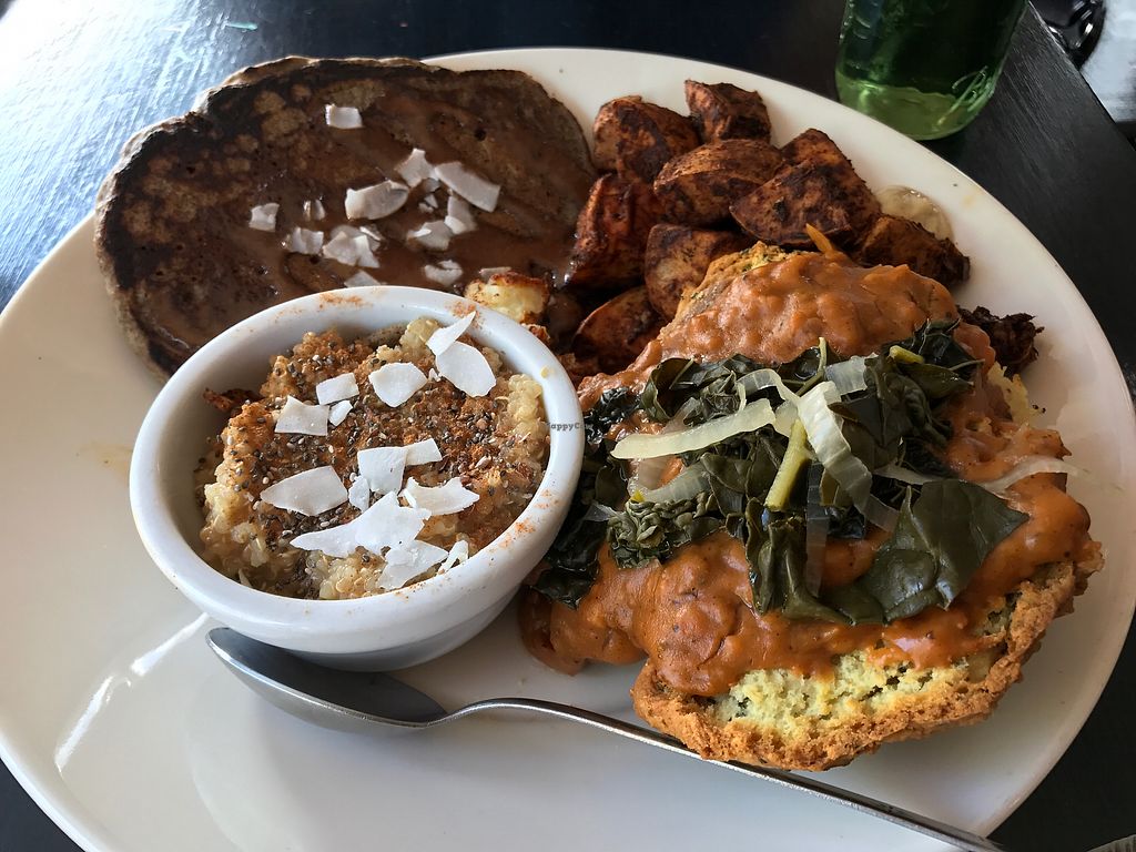 You can tell everything is made from scratch here. They make their own sunflower milk which they use in the coffee drinks, buckwheat pancakes were good (very dense), bisquits and gravy was really flavorful. Bisquit was a little dry, but I haven't found a vegan bisquit that wasn't. I can say that the Chai tea was prolly the worst we've ever tried, but it may have been made wrong and we didn't say anything to the server. My fiance gets Chai wherever we go, and we know that it can spicy, but it honestly tasted like she dumped a whole tablespoon of cinnamon, clove and nutmeg into some steamed milk. Maybe it's not always like that, but it was the only bad part of our experience.