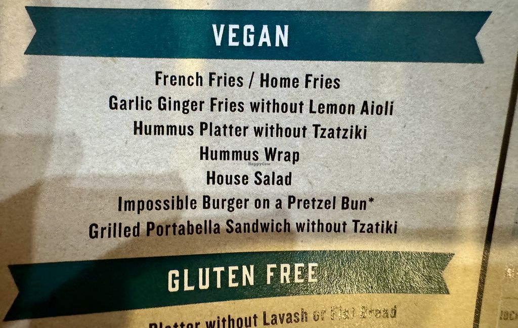 This is my favorite spot for dinner and drinks in the area! I always get the hummus wrap (already vegan). They also have the impossible burger (request pretzel bun) and a portobello sandwich (order without tzatziki). They also have several vegan appetizers such as a hummus plate and house made vinegar chips. Despite the other reviews, I think this place is excellent with a good selection of vegan options. The beer is also great!