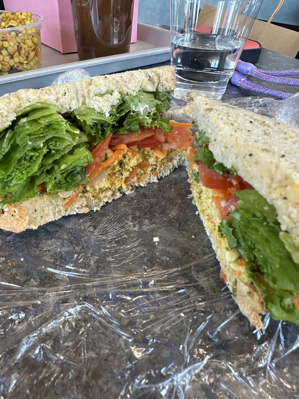 The sandwich I had was the best I had in a long time. They have spreads like mock–chicken, mock–tuna and eggless egg. I tried the eggless egg (tofu) and the woman working behind the counter suggested a sauce and other toppings. I also had a pecan banana muffin and a chocolate chip cupcake, everything was really good.