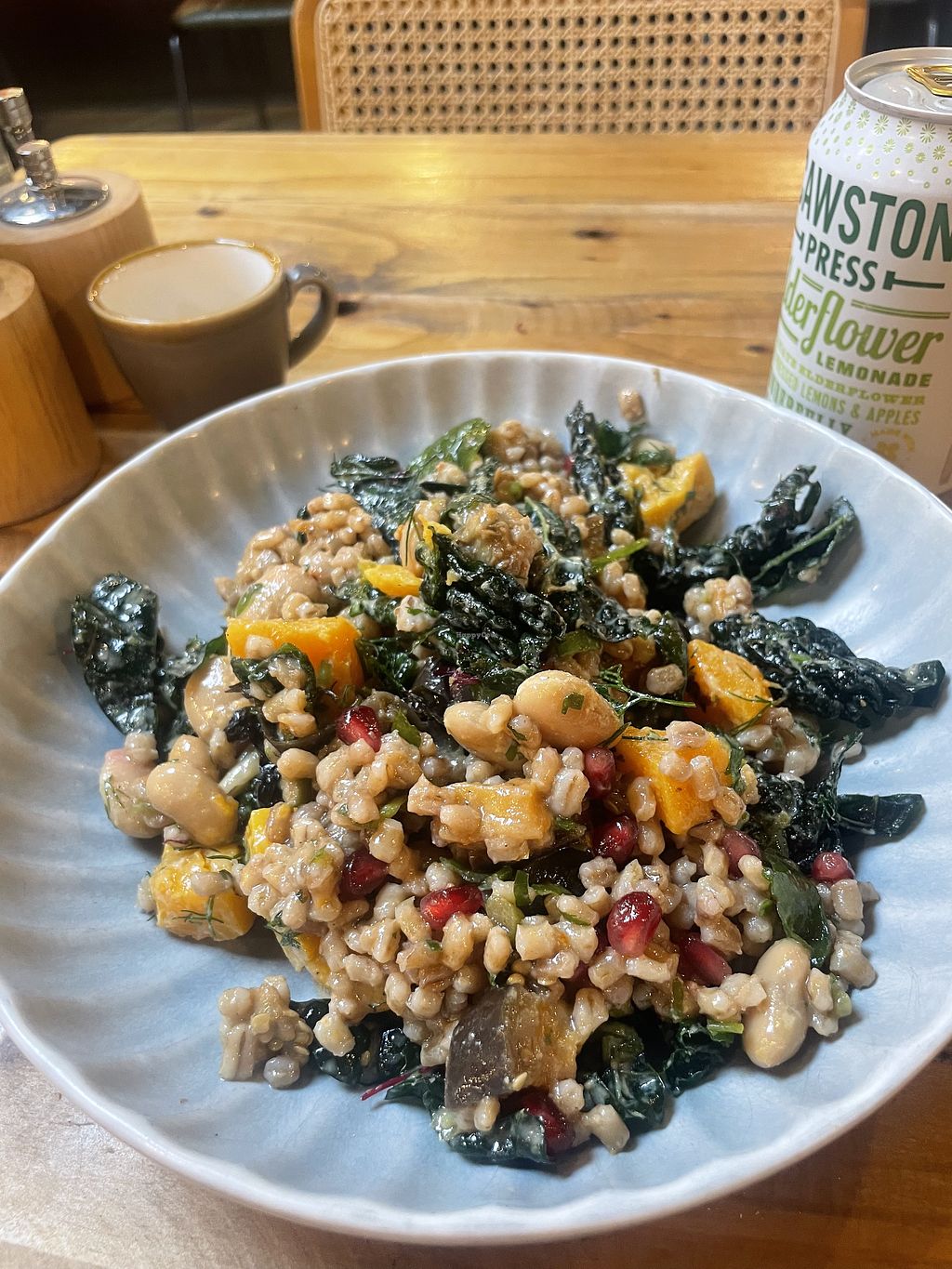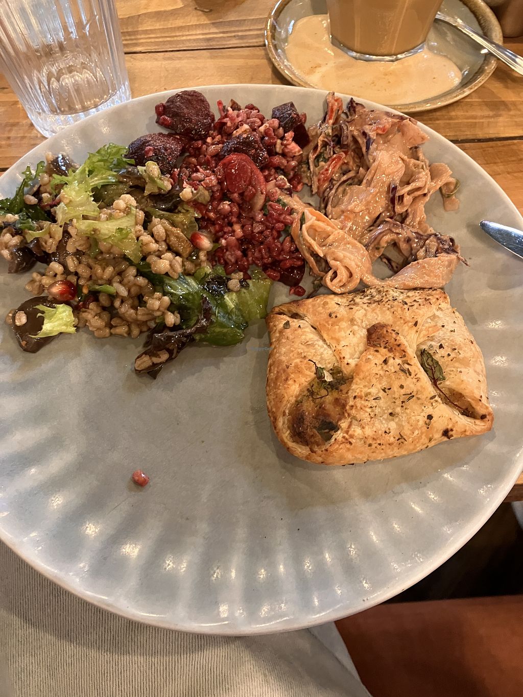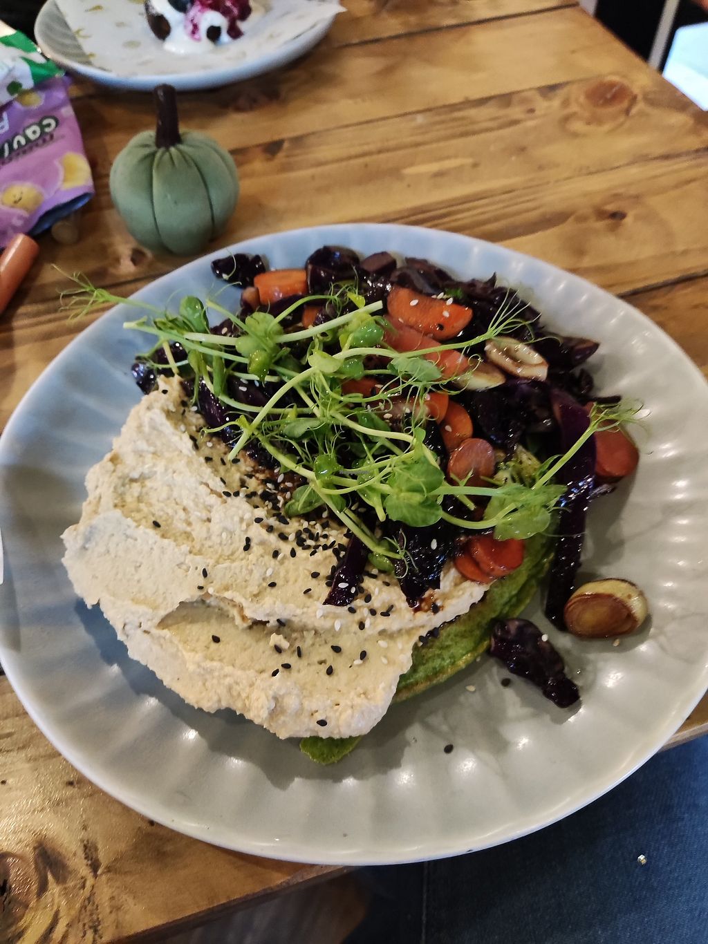 I have been going to Wild Root since they opened in 2021. The food is consistently delicious. They recently had a re-vamp and we visited today for the first time since they re-opened. We were not disappointed. The cafe is so warm and welcoming and the staff lovely and friendly as always. We had the sweet potato and harissa soup which was gorgeous. I had a potato and greek pasta salad on the side. The potato salad had a lovely zingy vinaigrette dressing which complimented the soup. The greek pasta salad was fresh and vibrant. My husband had the hummus and vegetable sourdough roll which he enjoyed immensely. He said the freshness and texture of the vegetables worked well with the creamy hummus. He normally hates aubergine but I think he may now be a convert!