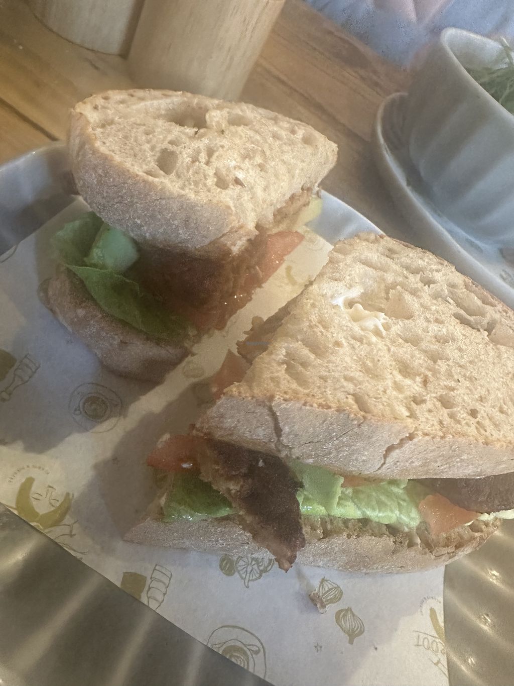 Been meaning to visit for a while and finally the opportunity presented itself! We arrived around 1pm and it was pretty empty - I was disappointed as I’d much prefer fully vegan places to be busy - but within a few mins of sitting down, the place packed out! I had a vegan lox cream cheese bagel - when it arrived I thought it looked a bit old, but it tasted fab. It had a dill cream cheese with the lox, as well as picked onions & capers for some tang. Partner had the TLT sourdough sandwich; it had a generous portion of well seasoned Smokey tempeh. We’ll definitely return as the salads in the cooler looked amazing!
