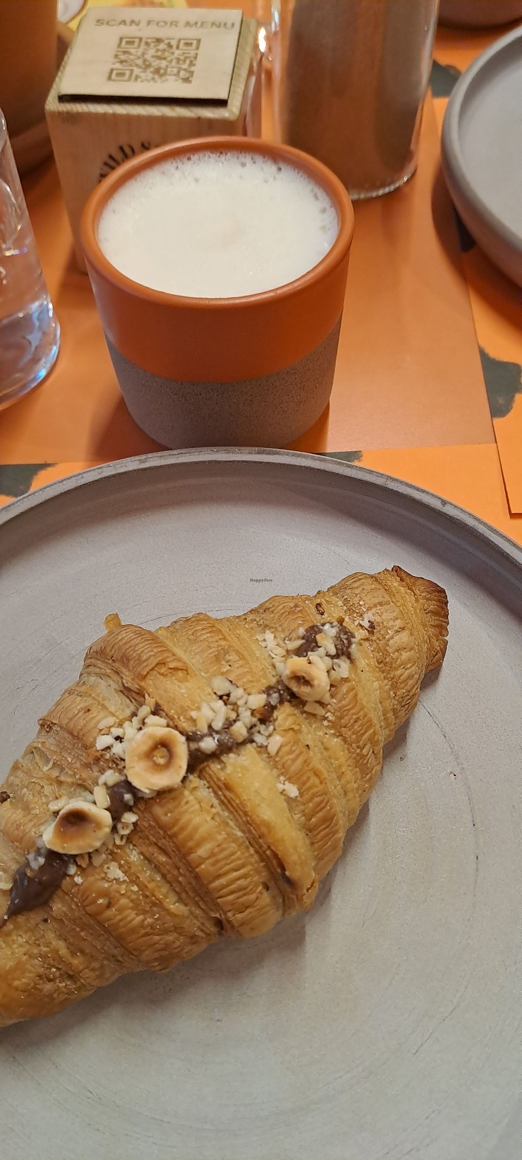 We ordered two "wild croissants", which are croissants filled with hazelnut cream (not sweet), and two cappuccinos with oat milk, and we paid €21.