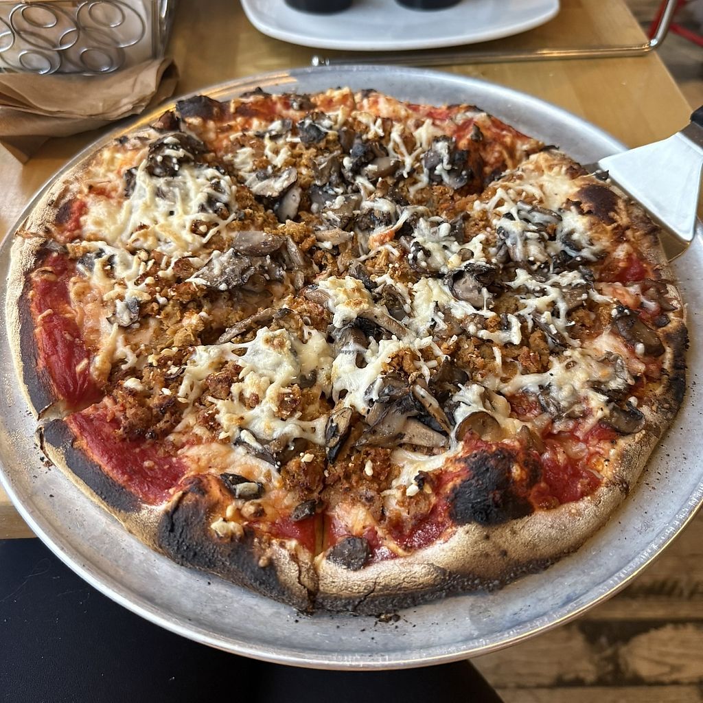 Vegan cheese, vegan sausage, wild mushroom blend pizza