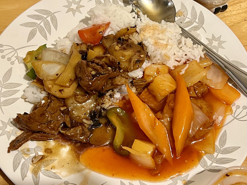 Vegan chicken sweet and sour, black bean with vegan duck & boiled rice…