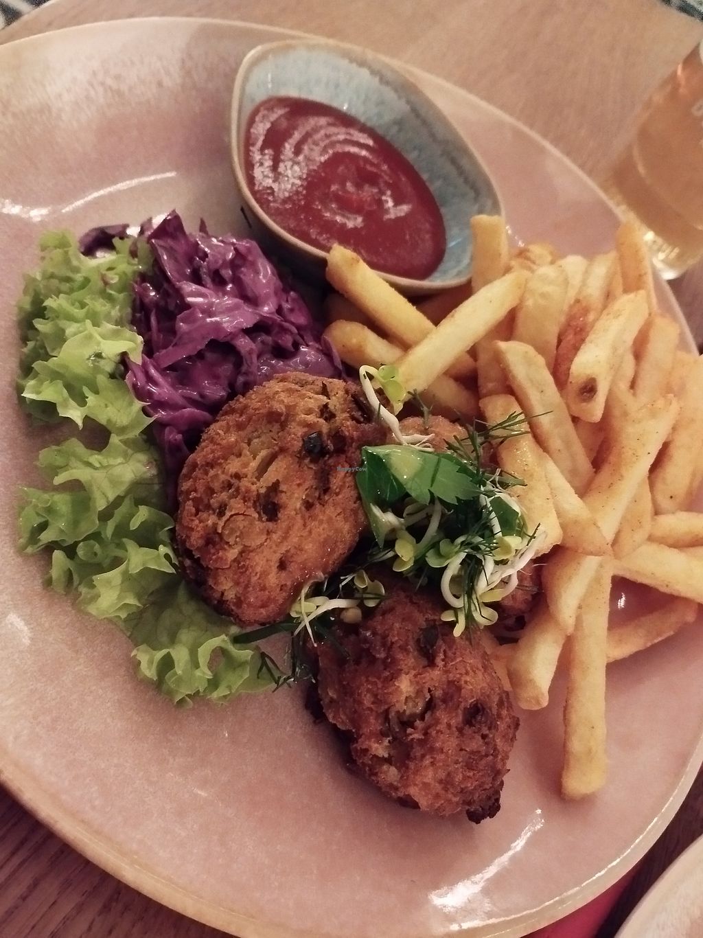 Ich vermisse Fisch und habe deshalb ein besonderes Interesse an veganen Fisch-Fakes. Hier gibt es Höchstpunktzahl. Alles außer dem echten Fisch ist vegan. Beilagen super. Veganer Fisch selbst gemacht aus Gemüse und nicht aufgetaut. Schöner Platz.