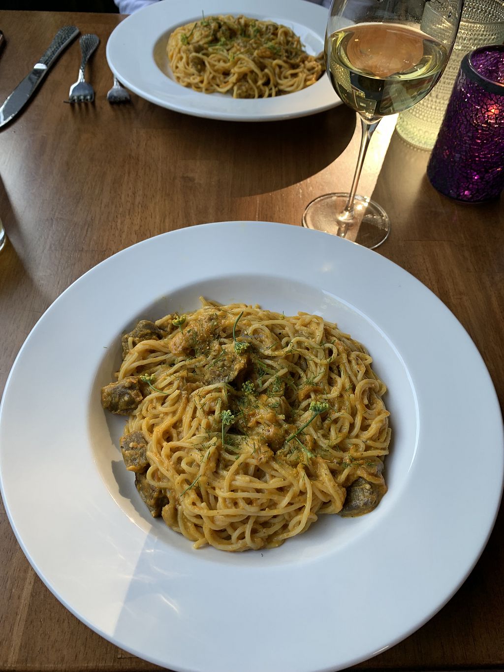 Homemade spaghetti pasta, sungold tomato sauce, roasted eggplant, & fe…