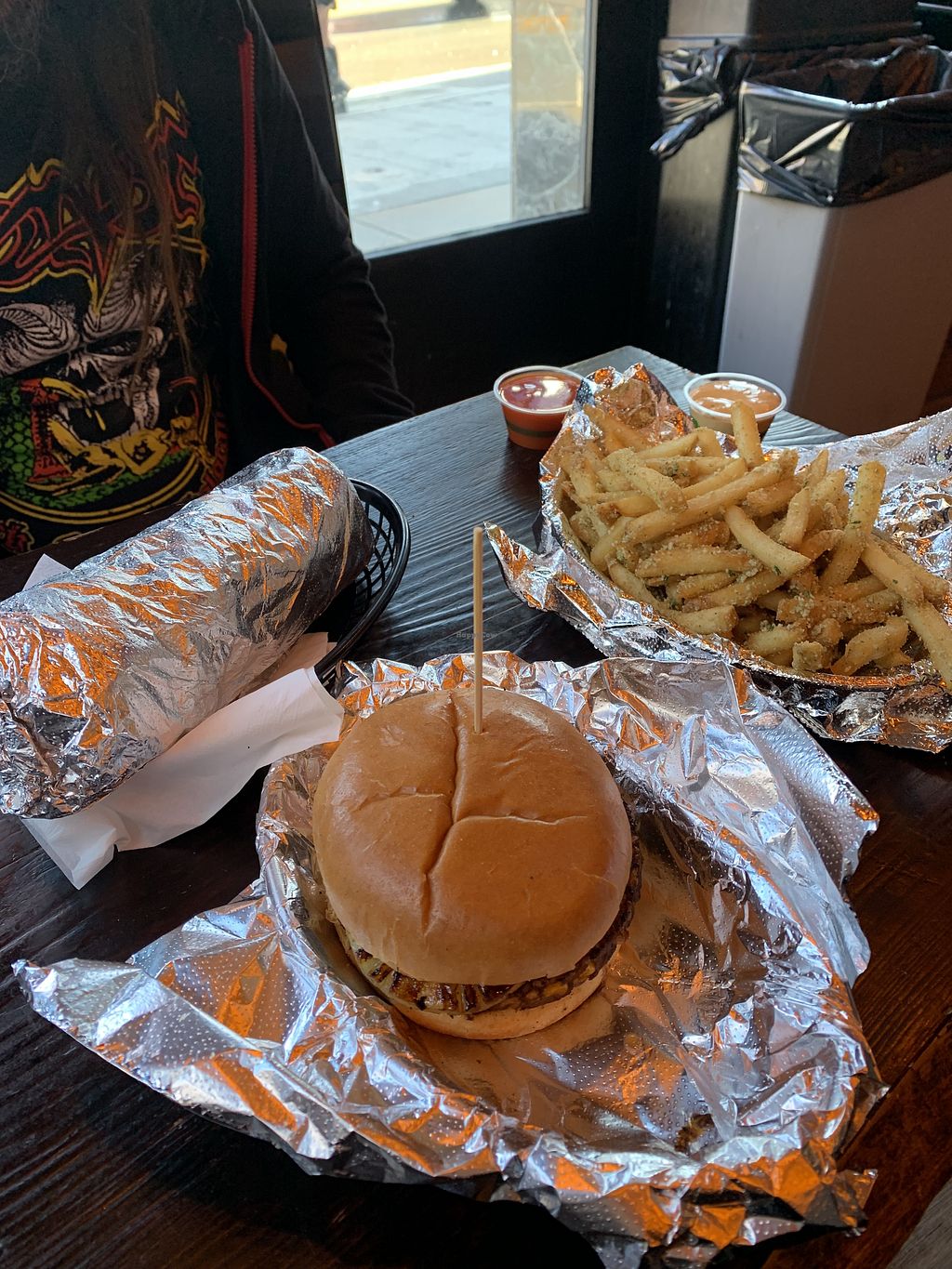 I got the regular burger (impossible patty, tomato, lettuce, onion, pickle, mustard, ketchup, mayo) and the tots. Fast-food, but slightly divey/way more personality and better quality. Would definitely recommend.
