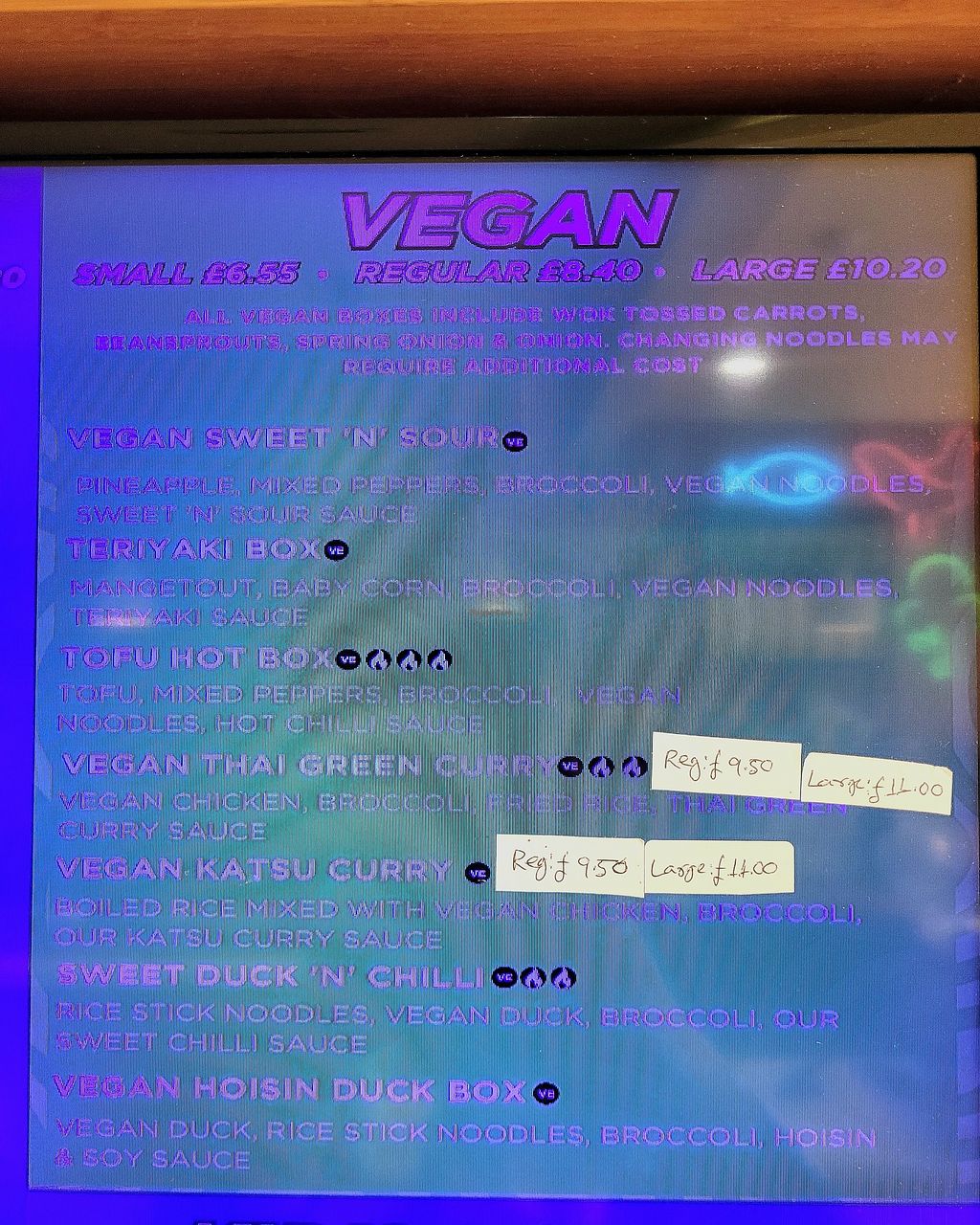 Read moreI initially wanted to order a Vegan Thai Green Curry but was told they did not have that available. I then tried to order a Vegan Katsu Curry only to be told the same thing. The same happened again with the Vegan Hoisin Duck Box. The chef finally intervened, only to abruptly tell his colleague on the till that they only had the Vegan Sweet 'N' Sour and Tofu Hot Box available from the vegan menu. In a restaurant, this type of thing definitely should have been established beforehand, and the encounter was awkward for everyone involved. I ended up going with a Regular Vegan Sweet 'N' Sour and the Salt 'N' Pepper Tofu from the street food menu.