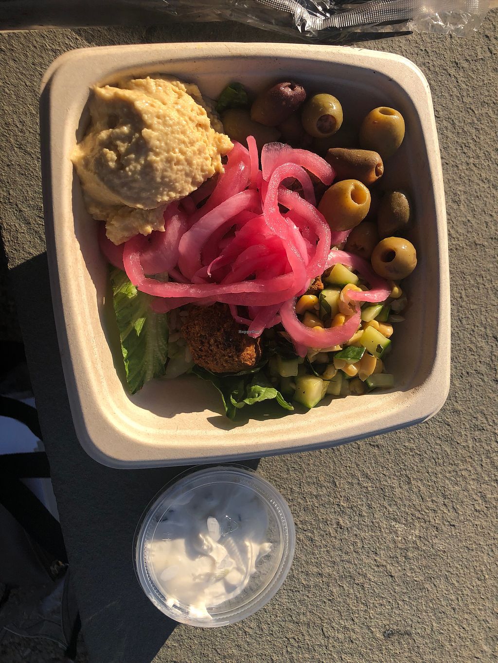 The vegan falafel bowl was tasty….loved that it had a lot of olives and hummus. I got the tzatziki on the side because no one could confirm the ingredients in that and my gut feel was it probably isn’t vegan….plenty of hummus though and didn’t need the tzatziki.