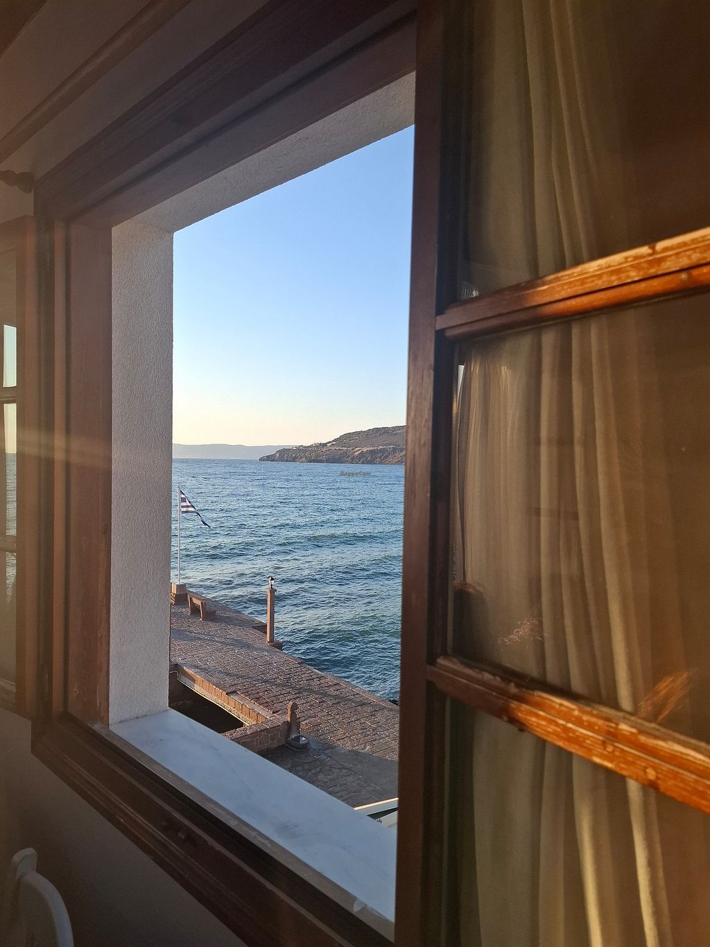 The restaurant has a lovely and unique seaside view from a roof terrace. Mainly visited by Greek people/locals. The entrance is a bit hard to find. You can find it an alley between the tourist shops. They serve Only local dishes. They offer wines of good quality. The number of vegan options are limited, but no different to all the other restaurants on the island Lesvos. The staff is very kind.