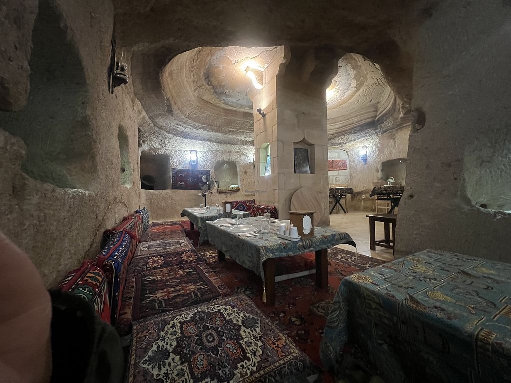 Very very friendly owner. He was so nice and made us vegan everything. They have vegan clay pot, mati plate, and custom made fire roasted veggie bread. The bread was super legit. Five stars here in Cappadocia. Great vibe inside too. Eat vegan food in a cave.