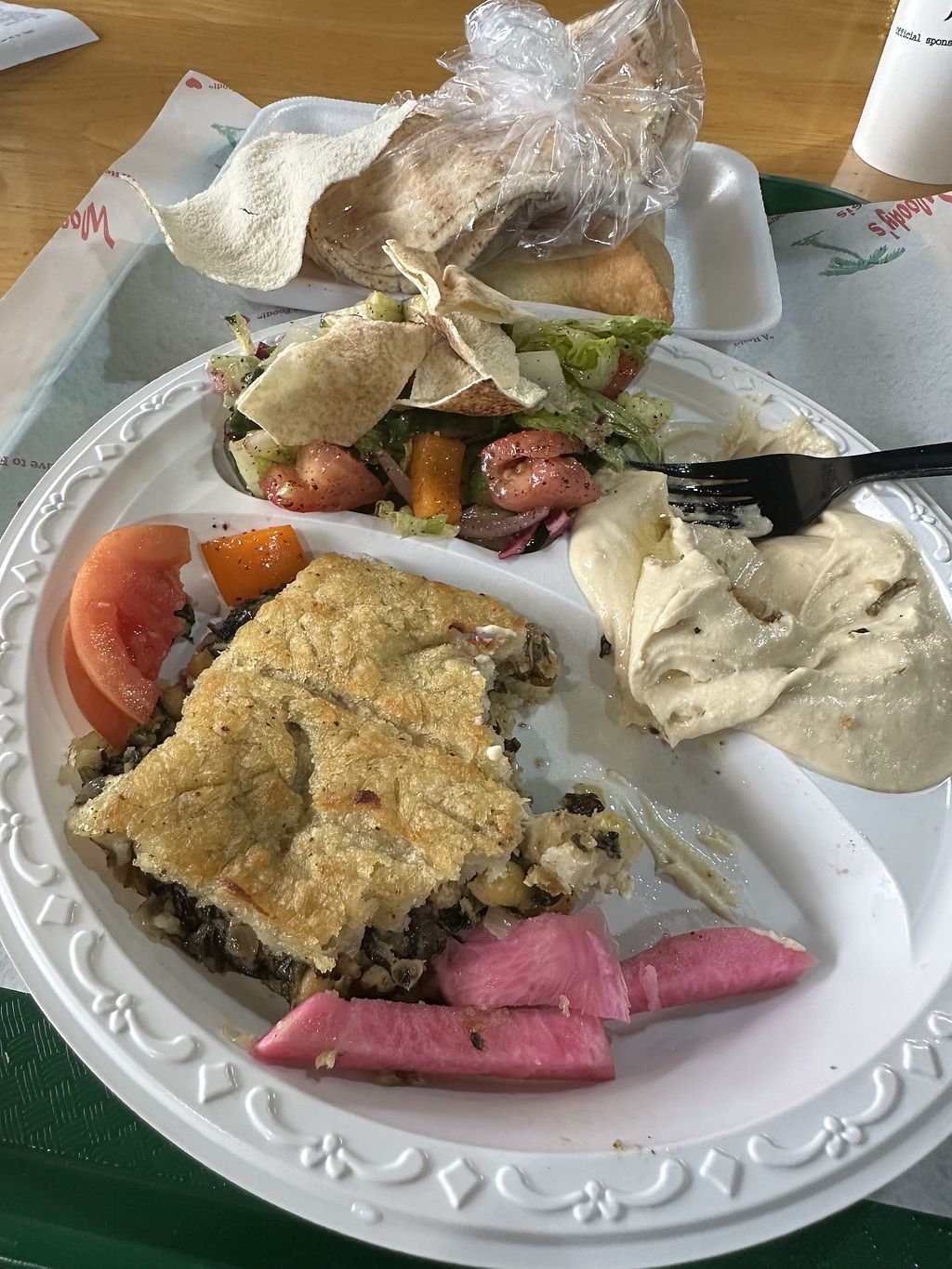 Woody's has a casual atmosphere with some "oasis-like" details such as fake palm trees. The prices were all very affordable and the menu had some nice variety for both veg*ns and omnivores. Service was pretty fast. Some meals have size options, so you can order a large or small depending on how hungry you are. I had an interesting potato dish with spinach. My friend ordered grape leaves and raves about the vegetarian cabbage roles.