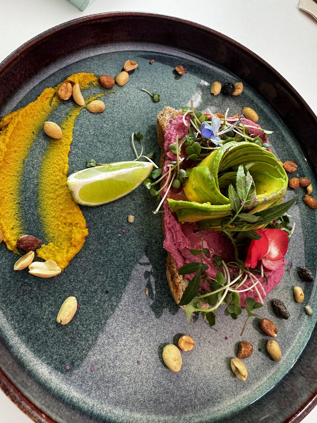 Serves meat, vegan options available. Restaurant with various vegan options, including a vegan avocado toast, hummus, tostones, and the 'I’m a Vegan Donkey' wrap. Items are clearly labeled.