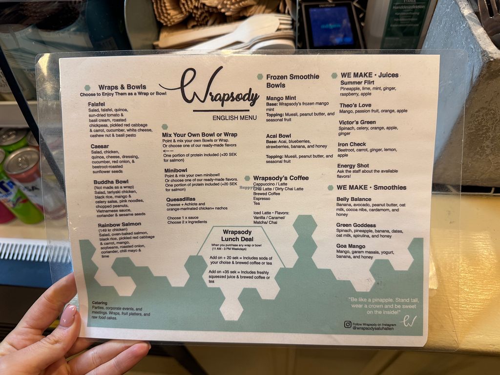 Serves meat, vegan options available. Wrapsody at Stora Saluhallen in Gothenburg is a bright, health-focused café known for its fresh and vibrant food. They serve wraps, salad bowls, smoothie bowls, cold-pressed juices, and specialty coffee, all made with high-quality, wholesome ingredients. With plenty of vegetarian and vegan-friendly options, Wrapsody is perfect for a light, nutritious meal in a relaxed and modern setting right in the heart of the city., Vegan Wraps, bowls, juices, sweat treats, falafel, option to create your own wrap or salad of your choice. Please note that many businesses in Sweden are cashless. Open Mon 10:00-06:00, Tue-Thu 10:00-18:00, Fri-Sat 10:00-18:30, Sun 10:00-17:00.