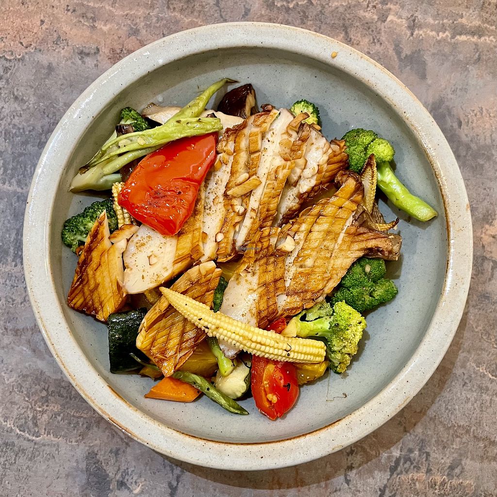 Serves meat, vegan options available. Modern Chinese restaurant offering veganizable dishes such as an oven-roasted seasonal vegetable set, and five grain rice paired with roasted vegetables including king oyster mushrooms, cauliflower, bell peppers and more. Open Mon-Sun 11:00am-9:00pm.