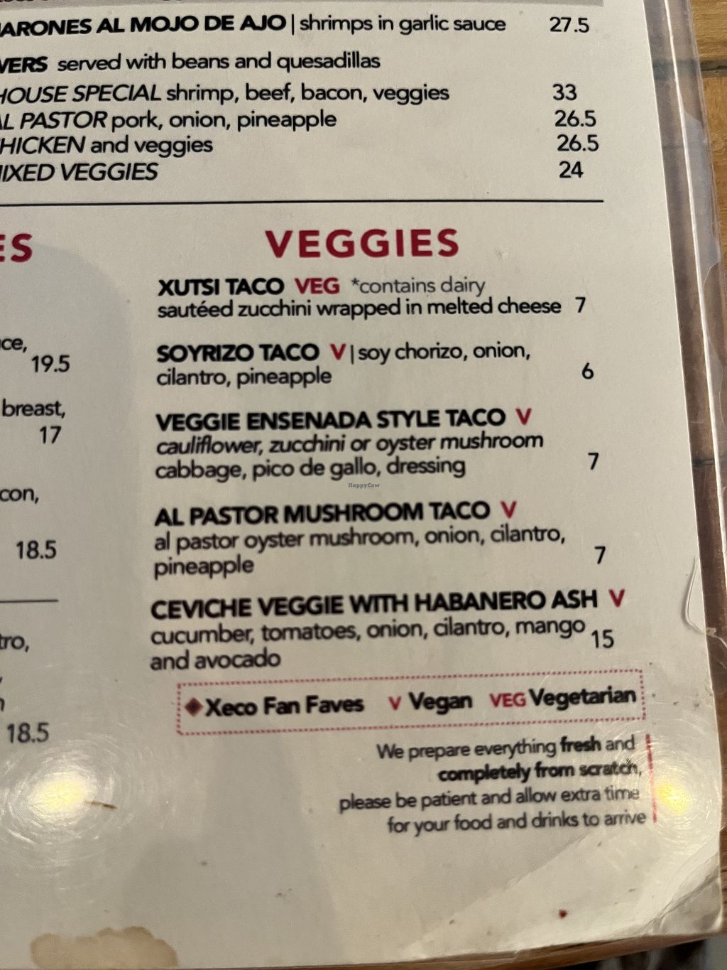 Has clearly labeled vegan options and vegetarian options, including vegan tacos, ceviche and salads. The tacos are delicious and the handmade tortilla is so good. Also had oatmilk for coffee. I would give 5 stars for food.