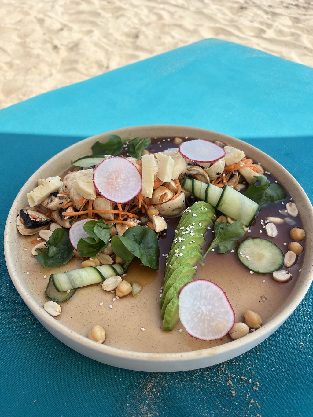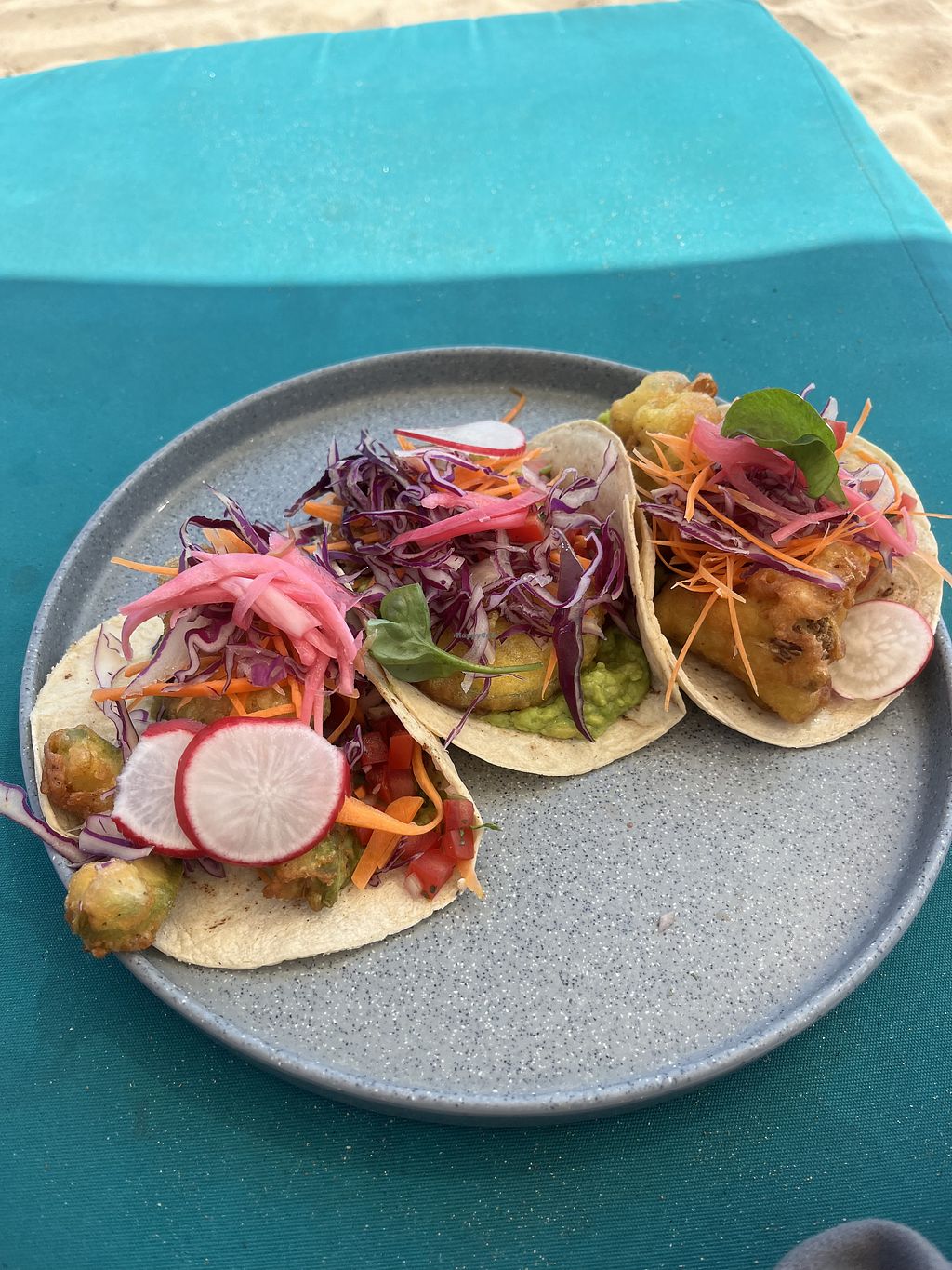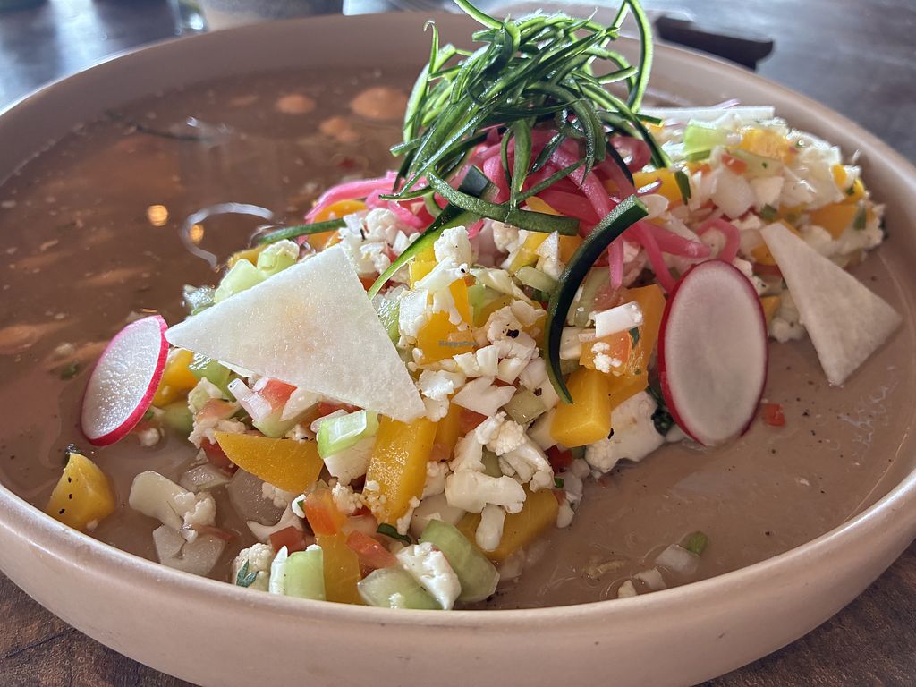 Such a huge vegan menu to choose from! I tried the enmoladas and the tempura tacos. Both delicious! I love the view and having my toes in the sand while there. I also drank a few agua del Dias, all flavors were amazing. I really wish I would have tried the desserts!