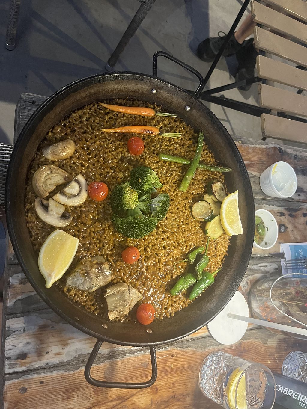 Wij hadden de vegan paella die ter plekke geserveerd werd op een apart tafeltje. (leuk Spaans gebruik) vooraf hadden we brood met zout alioli en olijven. (Alioli was niet vegan) Zeer vriendelijke en ijverig serveerders/serveersters. Prijs was redelijk hoog, maar dan heb je ook wel flink wat eten. (Je kan het meenemen) Locatie was echt top, aan het water en de boulevard.