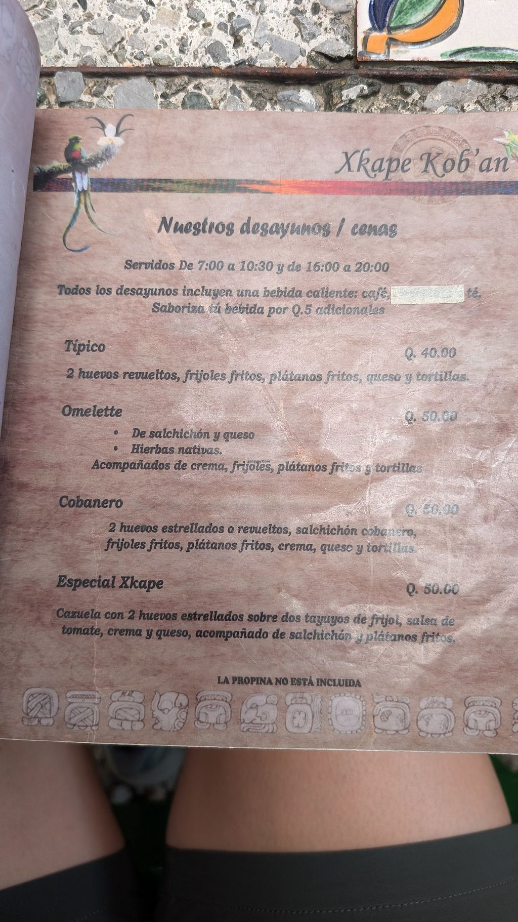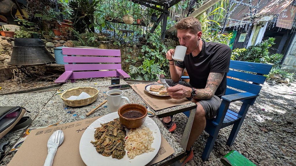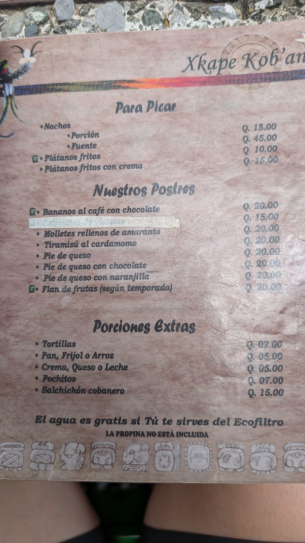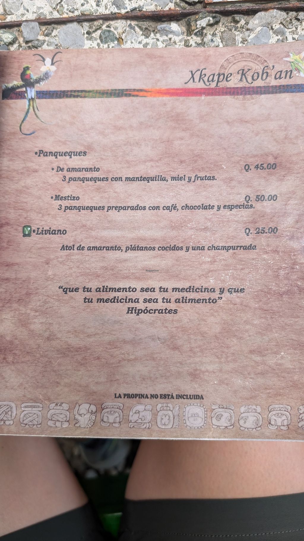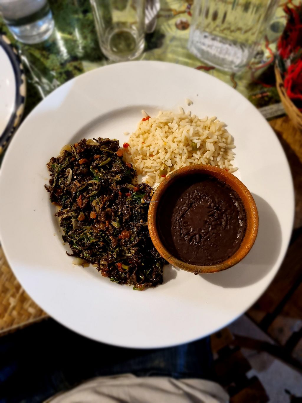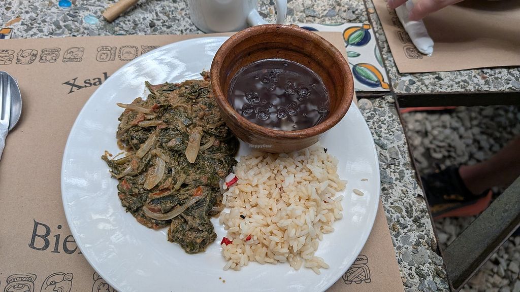 They had a few labelled vegan options. I went for the native herb plate which was some sauted greens, rice, beans and tortilla. The beans were a little lacking in flavour but otherwise the dish was really tasty and wholesome. Very good value for 50Q. Really loved the atmosphere there and very sweet cat!