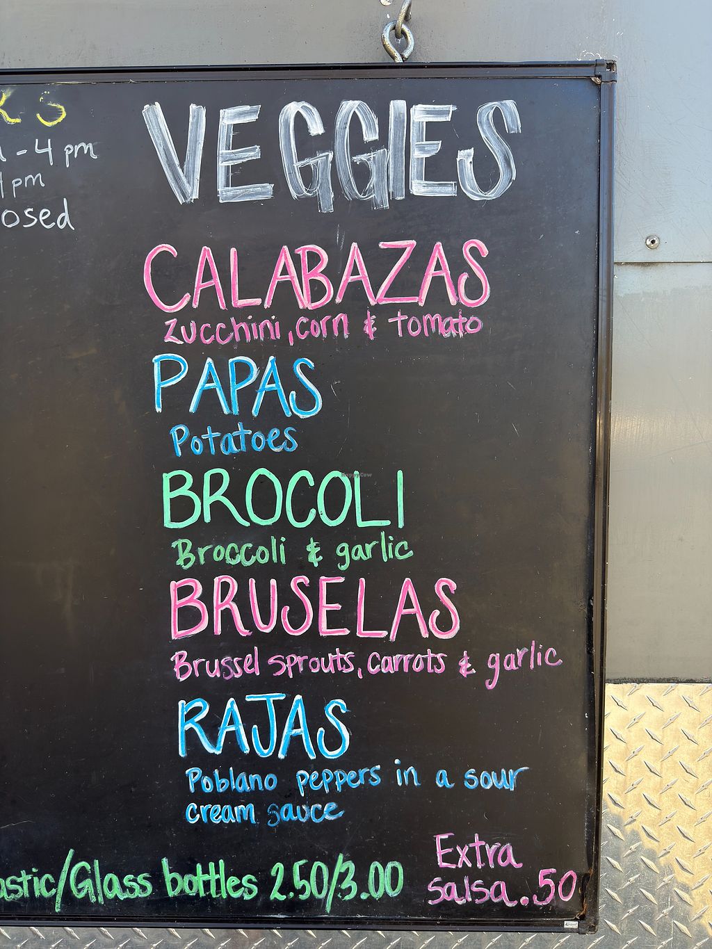 Serves meat, vegan options available. Food truck with vegan and vegetarian tacos. Menu is clearly labeled. Open Tue-Fri 11:00am-4:00pm, Sat 12:00pm-4:00pm.