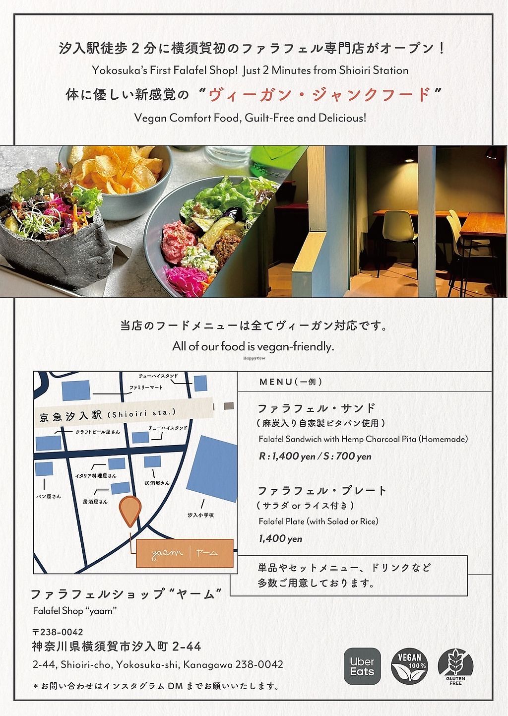 Just a 2-3 minute walk from Shioiri station, this fully vegan restaurant offers a relaxing vibe & unique, spice-flavored dishes. The manager, who has not been able to eat meat since birth, discovered falafel, and serves it in creative twists like a falafel sandwich with house-made hemp charcoal pita and a falafel plate with salad or rice. Has seasonal add-on toppings, Craft cola, craft ginger, and coffee are also available. Open Wed-Sun 11:00am-3:00pm, 5:00pm-8:00pm. Closed Mon & Tue. Every other weekend offers alcohol.