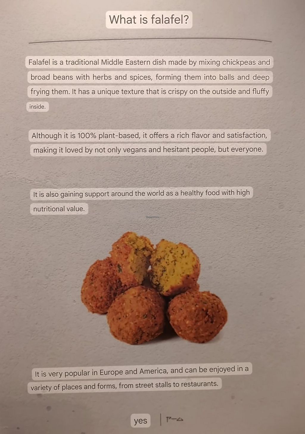 Amazing food, the owner was really nice and we had a lovely conversation. I really enjoyed the background music. It was a great experience and I fully recommend. I had falafel, Cauliflower salad, hummus, Tofu, sweet potato crisps with vegan butter and sorbet.