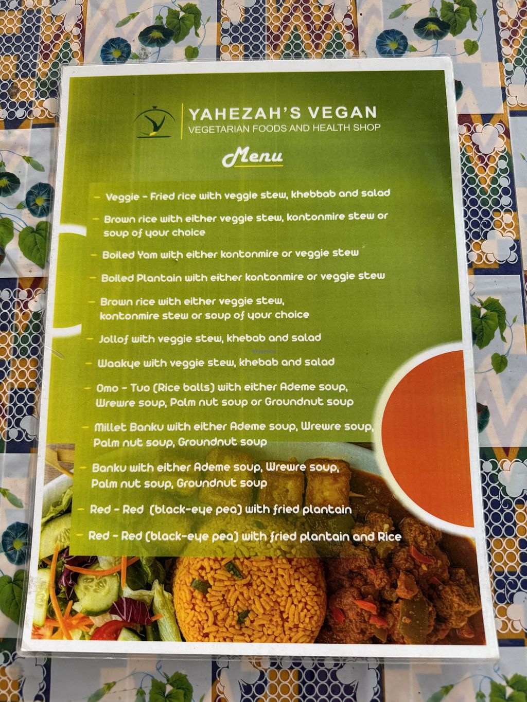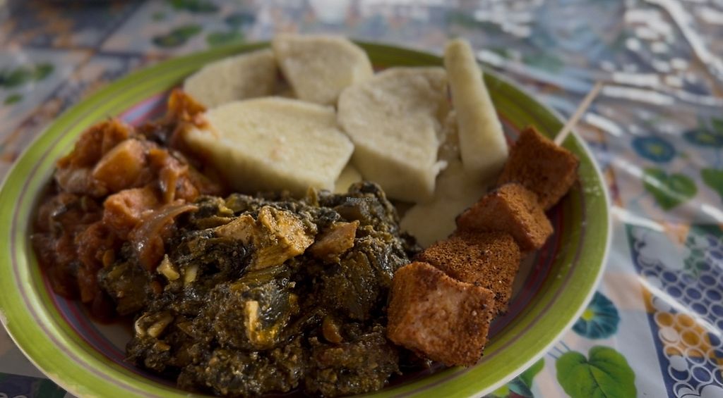 Authentic Ghanaian vegan dishes. Simple yet delicious! 😋 The restaurant is located next to an organic grocery store. I ordered a vegetable stew (pumpkin, taro leaves) served with Ghanaian yam. I also had some soy skewers. The chef was very friendly and the service was impeccable.