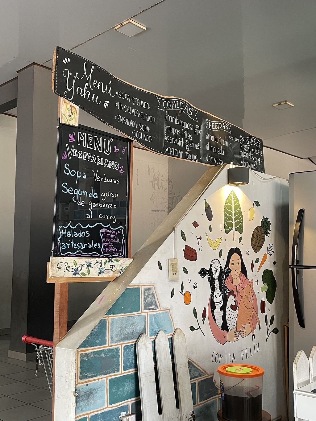On the second floor of the Mercado municipal near the back. Really nice fully vegetarian place, the menu of the day is great value and he also makes burgers and hot dogs. The fries are also great.