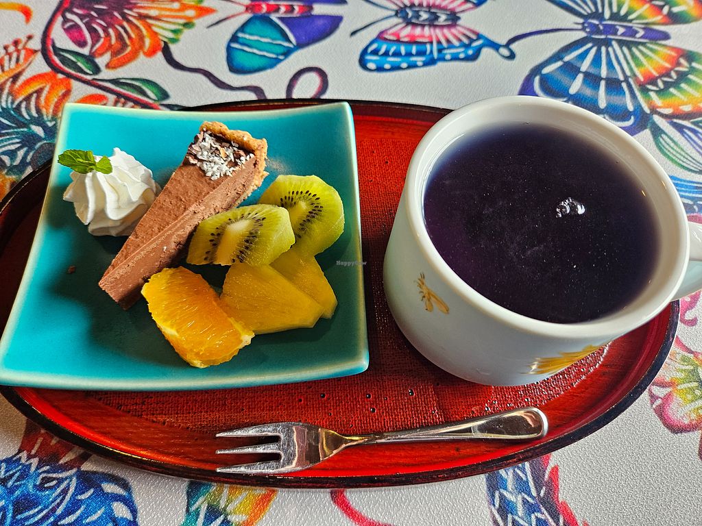 The menu contains a cake with eggs, which can be replaced with a vegan desert. Though while they stressed that the chocolate tarte was vegan, I believe the cream it came with wasn't.