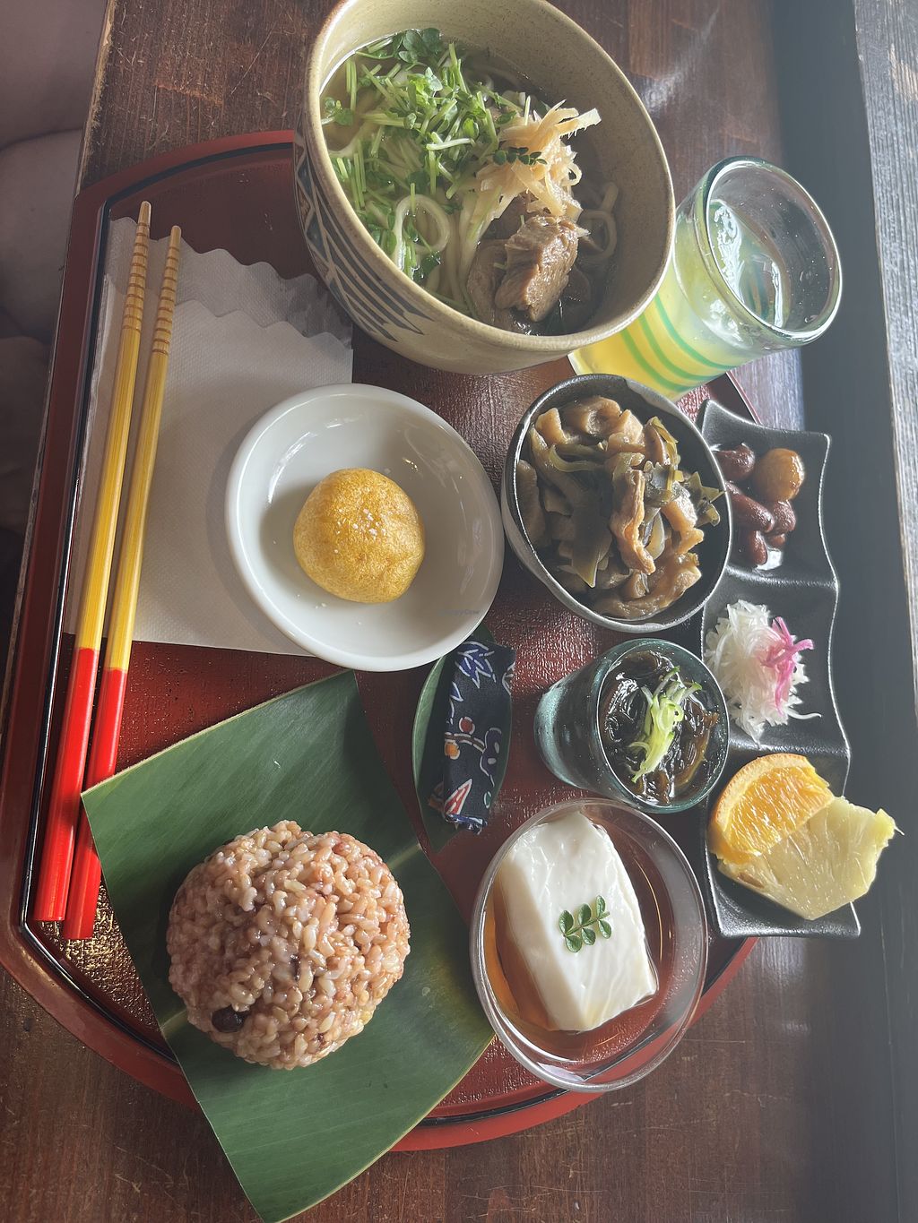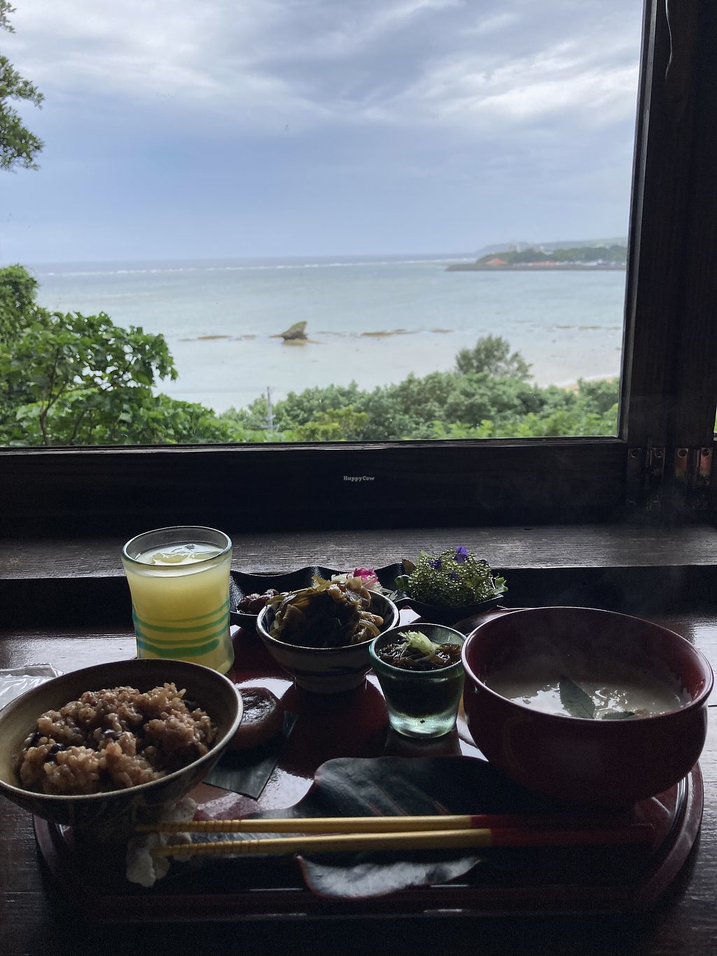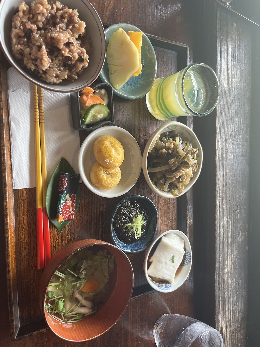 We ordered three different lunch sets. Two noodle sets were vegan and one rice set was easily veganized. The restaurant sits on a hill and is only accessible by 100 or so steps. The view of the ocean and surrounding forest was sublime.
