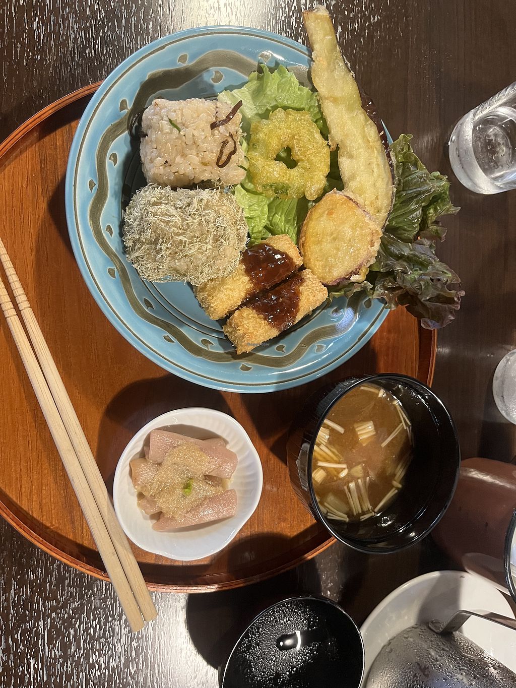 They offered us one lunch meal that was vegan. Lovely veggies with tempura and rice and some mushroom soup. In the end we got some black tea. We were more than full after that meal! The owners were lovely and very kind. Would def recommend it!