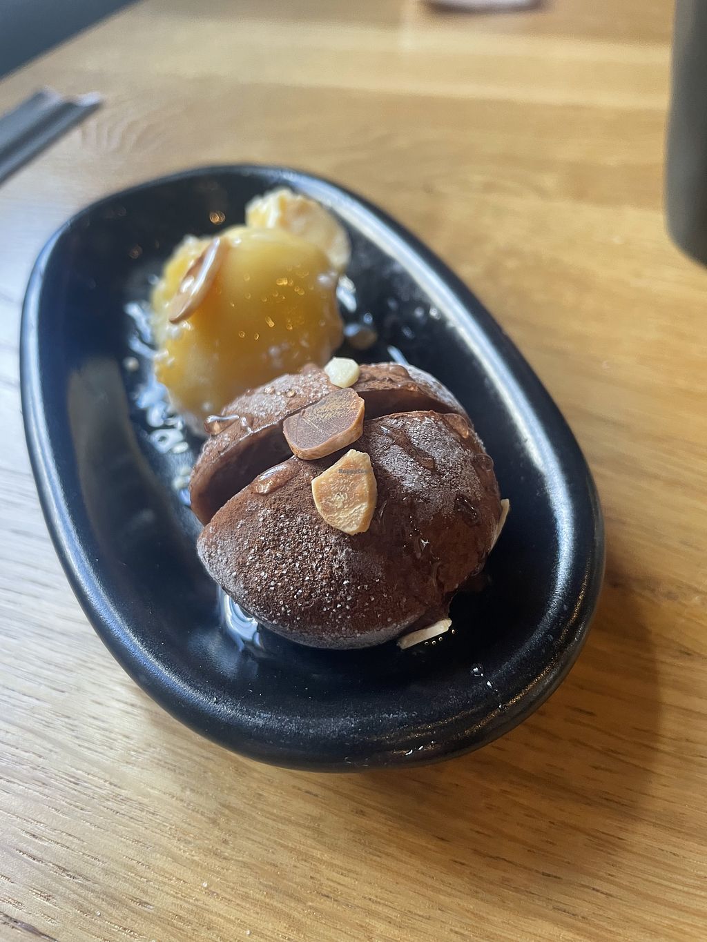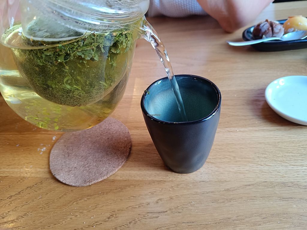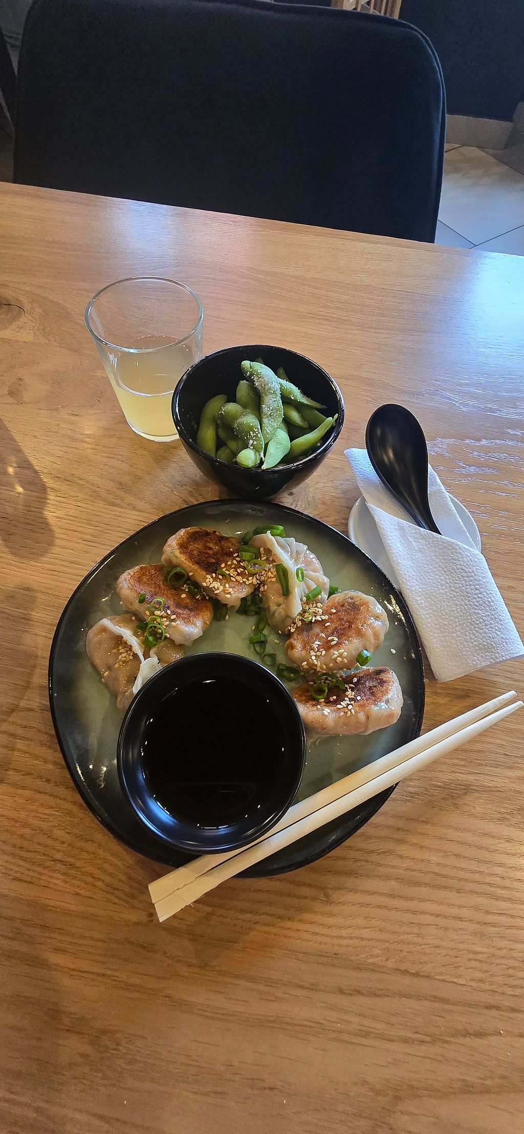 Gyoza pierogi. Edamame and Yuzu kombucha.