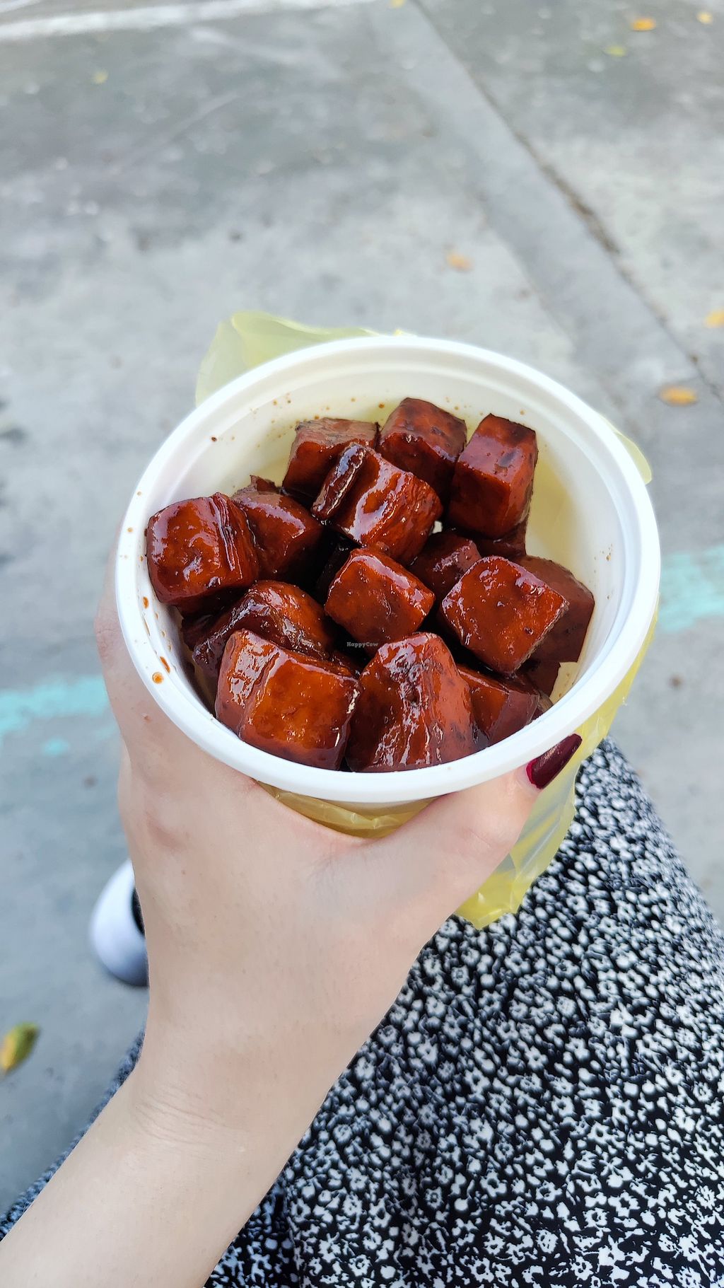 Delicious tofu. You can choose between spicy and non-spicy. The tofu is freshly prepared on site and comes in a handy box with a lid, so you can either eat it straight away or take it with you for later. We found the tofu to be very tasty, with a slightly sweet, smoky flavour. A great snack for on the go.