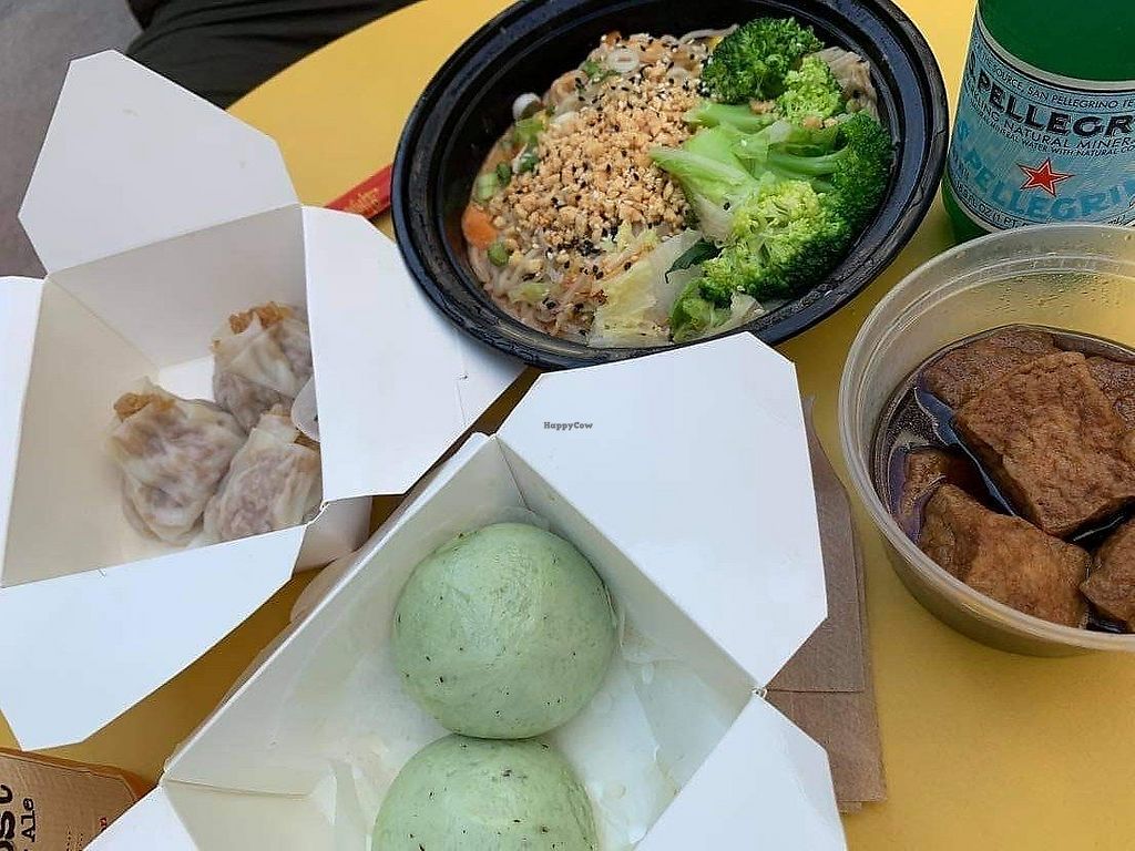 Hot noodles with peanuts & sesame, braised tofu, veggie bao, sticky ri…