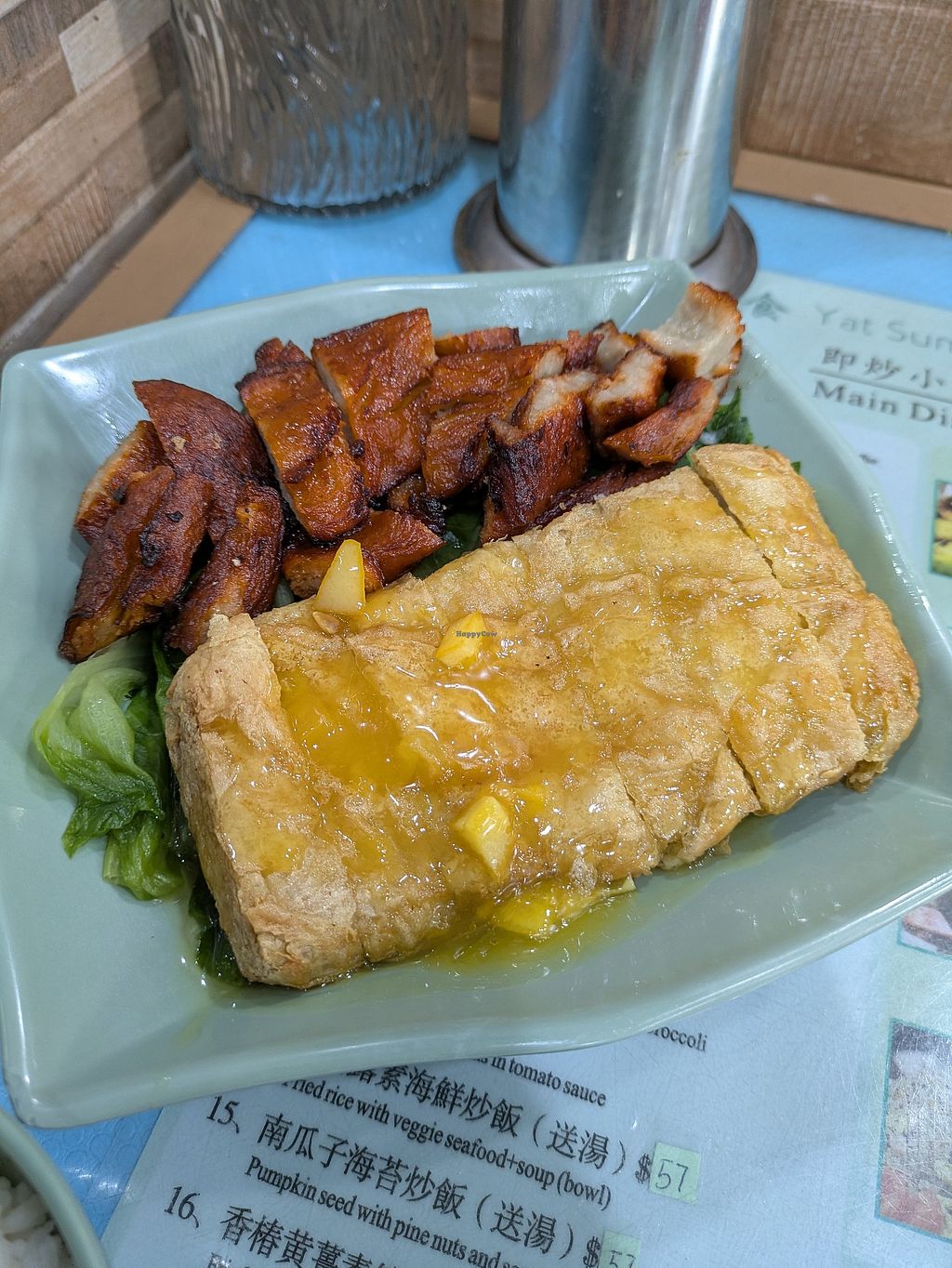 The vegan hole-in-the-wall eatery to complete your HK experience. We had the tomato shrimp (#13) and tofu skin with ginger and veggies (#8). Both were excellent and both were gentle on our tummies and our wallets. The lady is friendly and gave us recommendations. Tiny place with shared seating, but relatively quiet and homey. Give it a try !