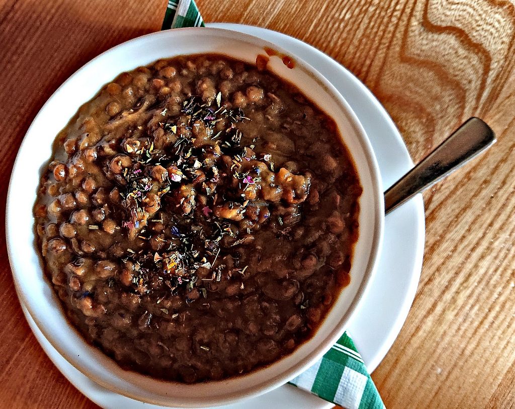 Veganer Linsen Eintopf, lecker. Zum Frühstück warmes Porridge (mit Wasser zubereitet) mit Zwetschken Röster und frischen Früchten, liebevoll dekoriert.