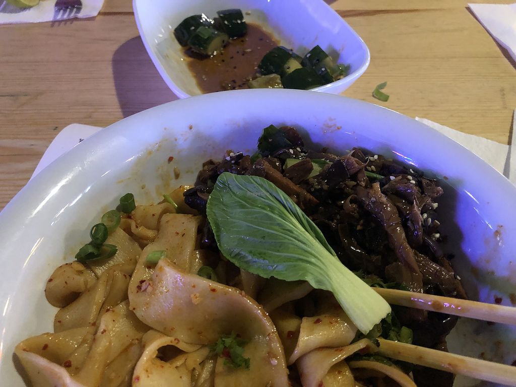 Serves meat, vegan options available. Small Chinese-style eatery located at Stacja Food Hall offering hand-pulled biang biang noodles, noodles with tofu and mushroom, noodles with hoisin eggplant, veggie gyoza, dim sum, and sides like spicy cucumber and edamame. Open Mon 12:00-21:00, Tue-Fri 12:00-22:00, Sat-Sun 12:00-00:00.