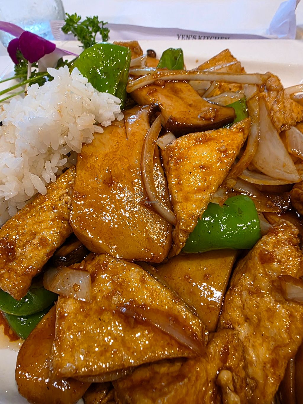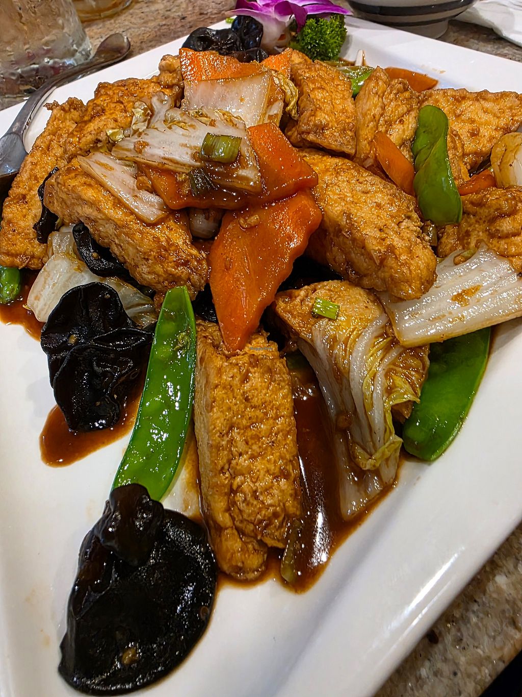 We tried the Dried Chili with Organic King Oyster Mushrooms and Fried Tofu, which was spicy but not overwhelmingly so. We also tried the Vegetable Lo Mein and the Home Style Tofu, also quite tasty. Portions were generous and reasonably priced for this area.