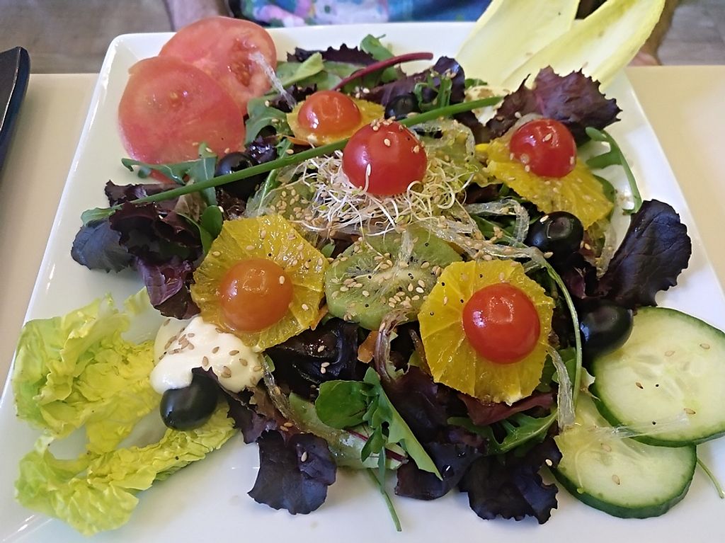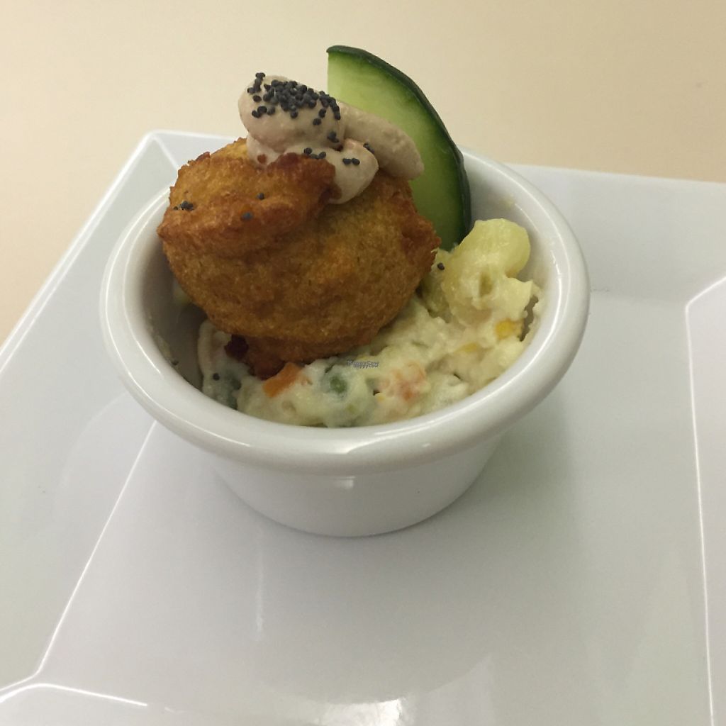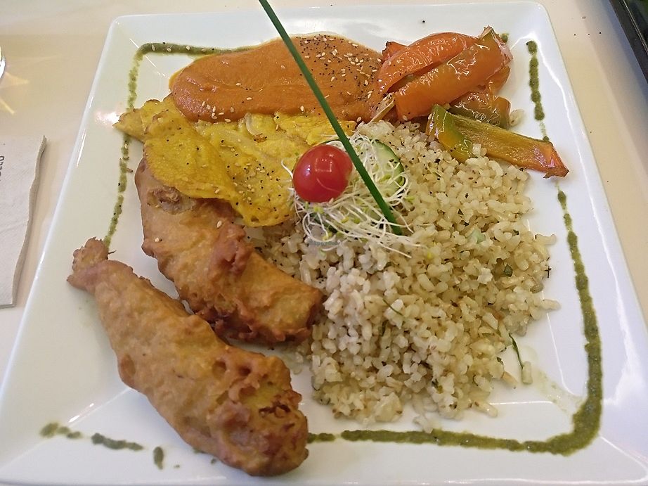 zucchini fritters, tofu salad, egg with potatoes, moussaka