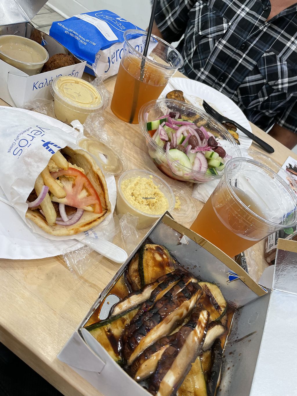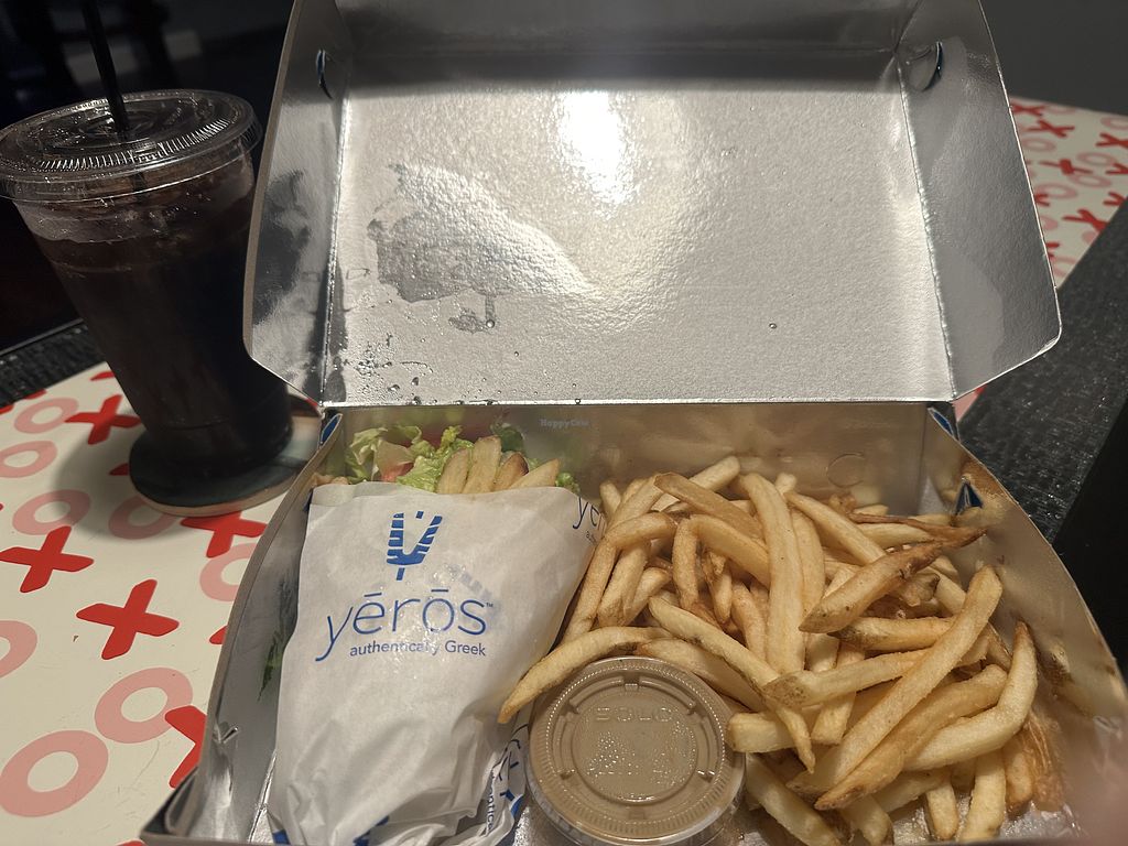 Falafel pita no tzatziki comes with tomato, onion, and fries.