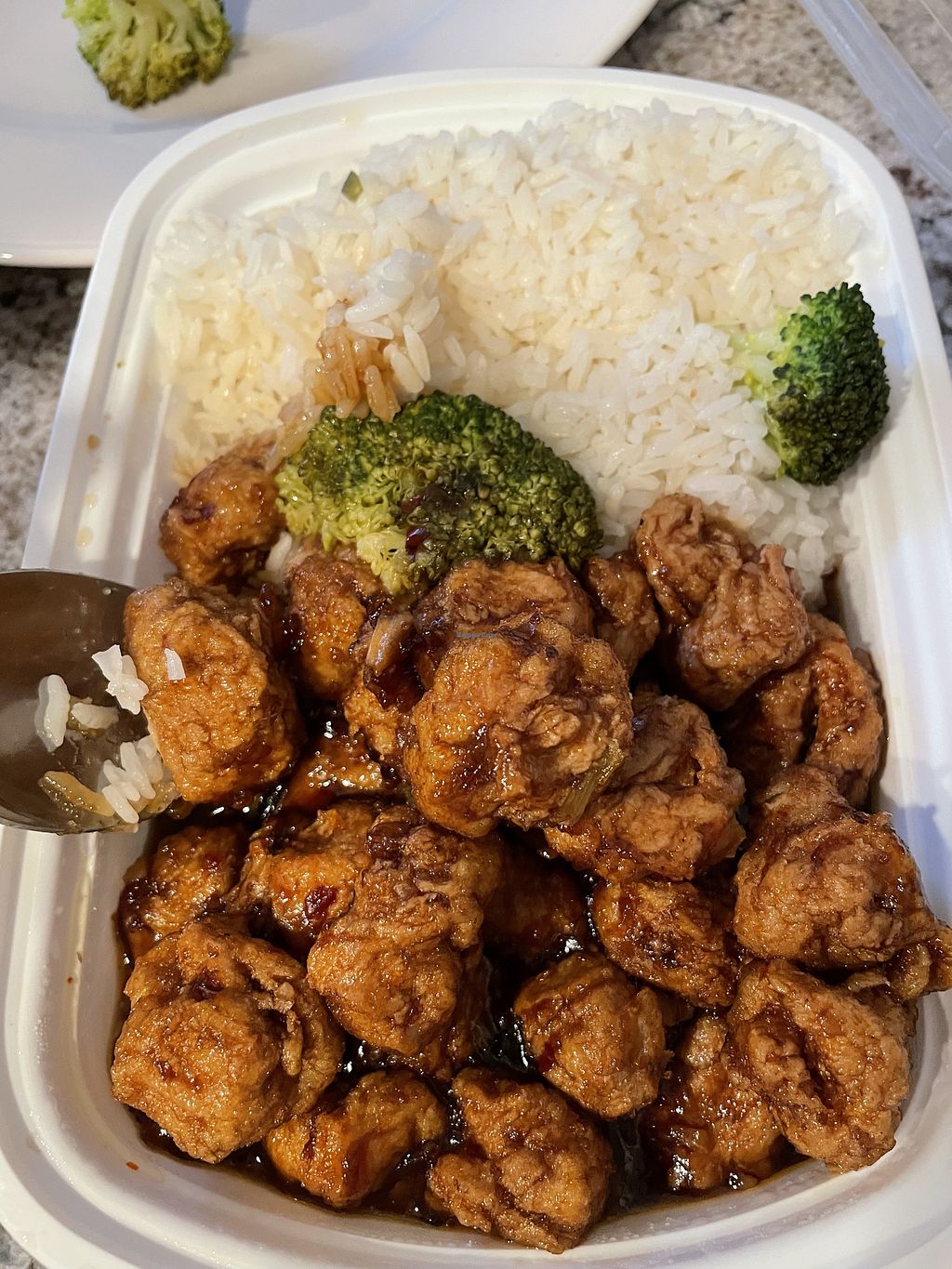 General Tso’s with soy protein and white rice