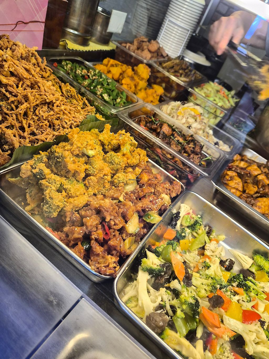 Friendly staff, good food at cheap reasonable prices. I went there on weekday lunch and was very crowded by noon. Ordered 2 sides mix vegetables and rice for $2.40 only.