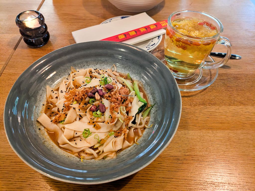 Their description on the menu for Dan Dan Noodles sounded so good that my friend and I both ordered it. And, wow, was it good. Even better than the description. The Chrysanthemum Tea was excellent, and also beautiful, with flowers in full bloom, set off by red goji berries. The outdoor seating is also nice on a warm summer evening. The waiter was happy and friendly. We talked for a couple of hours after our meal. All in all, a very pleasant dinner.