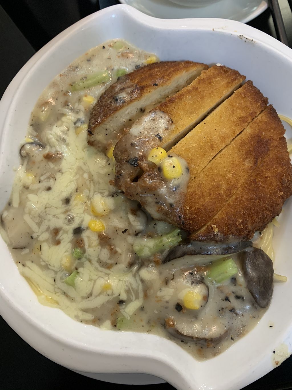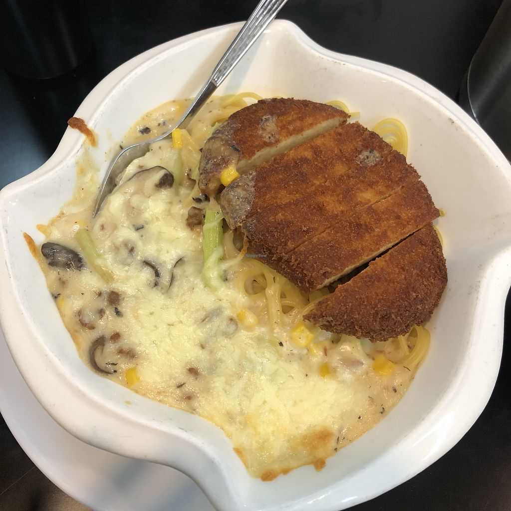 Baked spaghetti with soy pork cutlet- might be real dairy cheese.. bew…