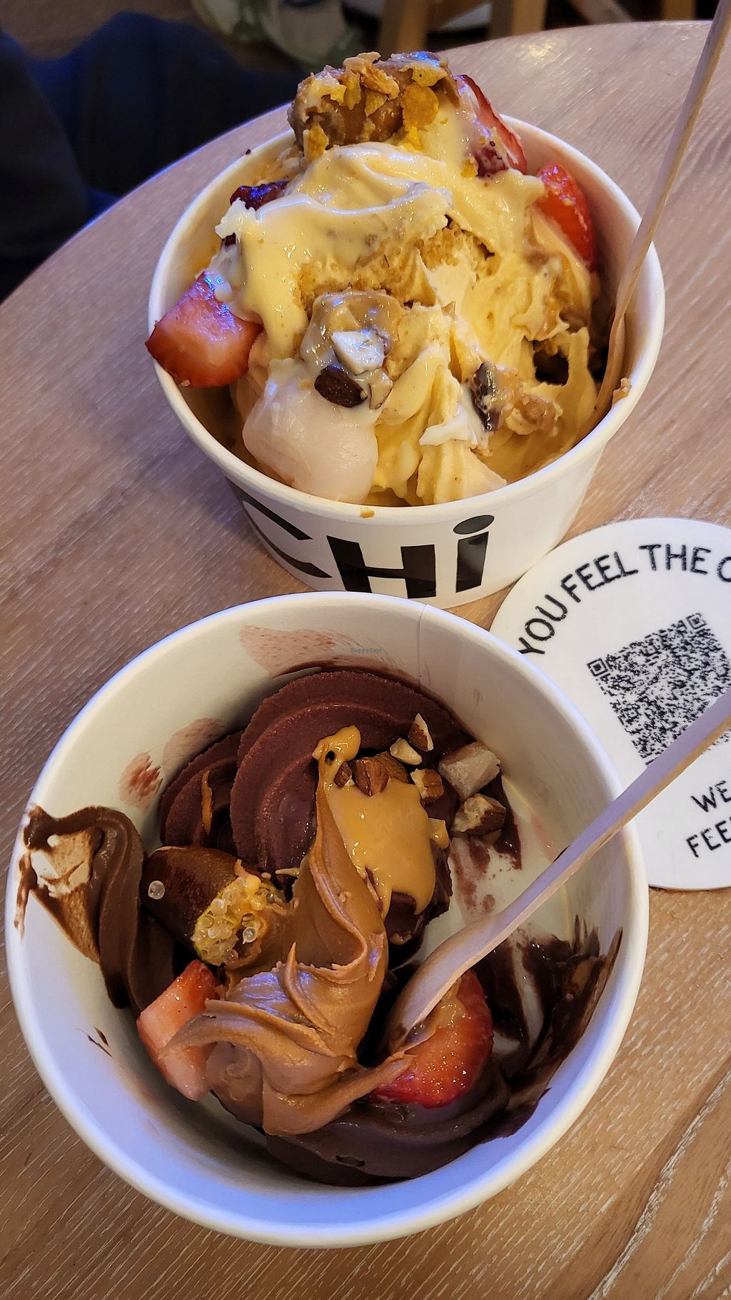 Yummy! Banana and chocolate soft serve with fruit, mochis and pearls