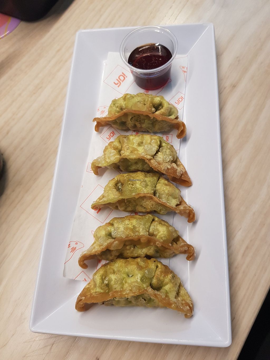 Connecting planes at Heathrow. Stopped at Yo! Sushi. Many vegan options. Got the vegetable fire cracker fried rice. It was tasty and nice to get some hot nourishing food in the midst of long journey.