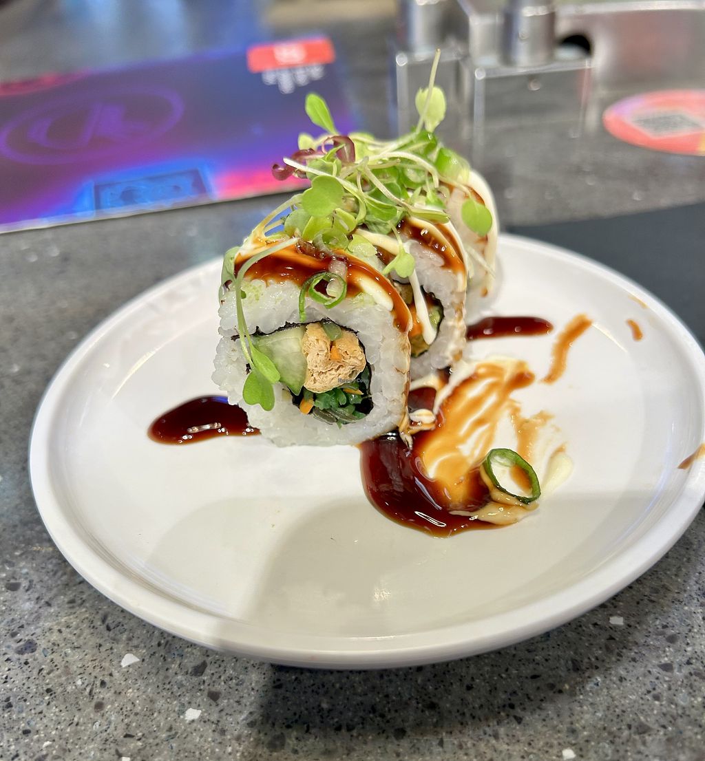 Cons: Conveyor belt can lack vegan options, Might be a wait to get a seat with 2+ people